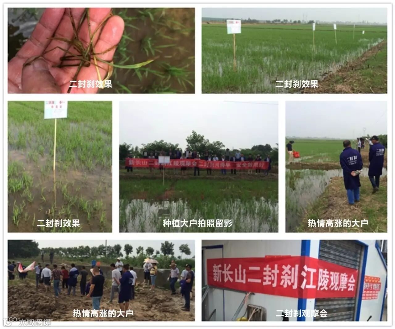 这块田播种后9天开始用的二封刹,一套半一桶水,1.2亩。观摩会来了30个农户,他们一起加起来种了5000亩地。一起到田里观看了实际效果,除草效果非常不错。