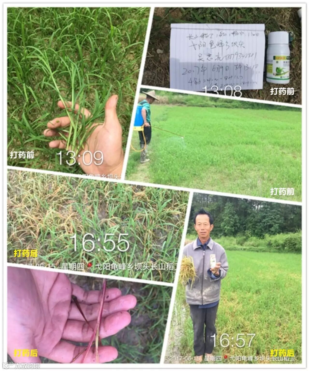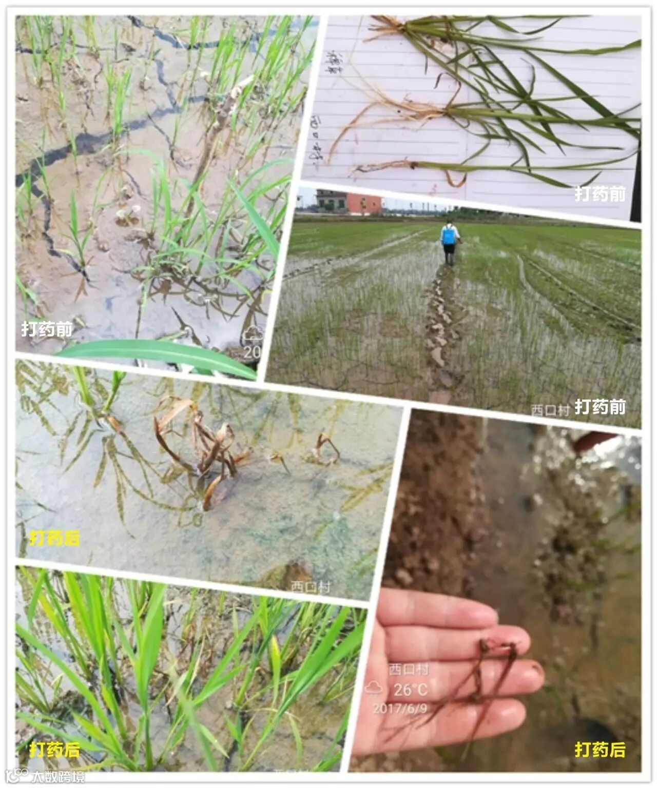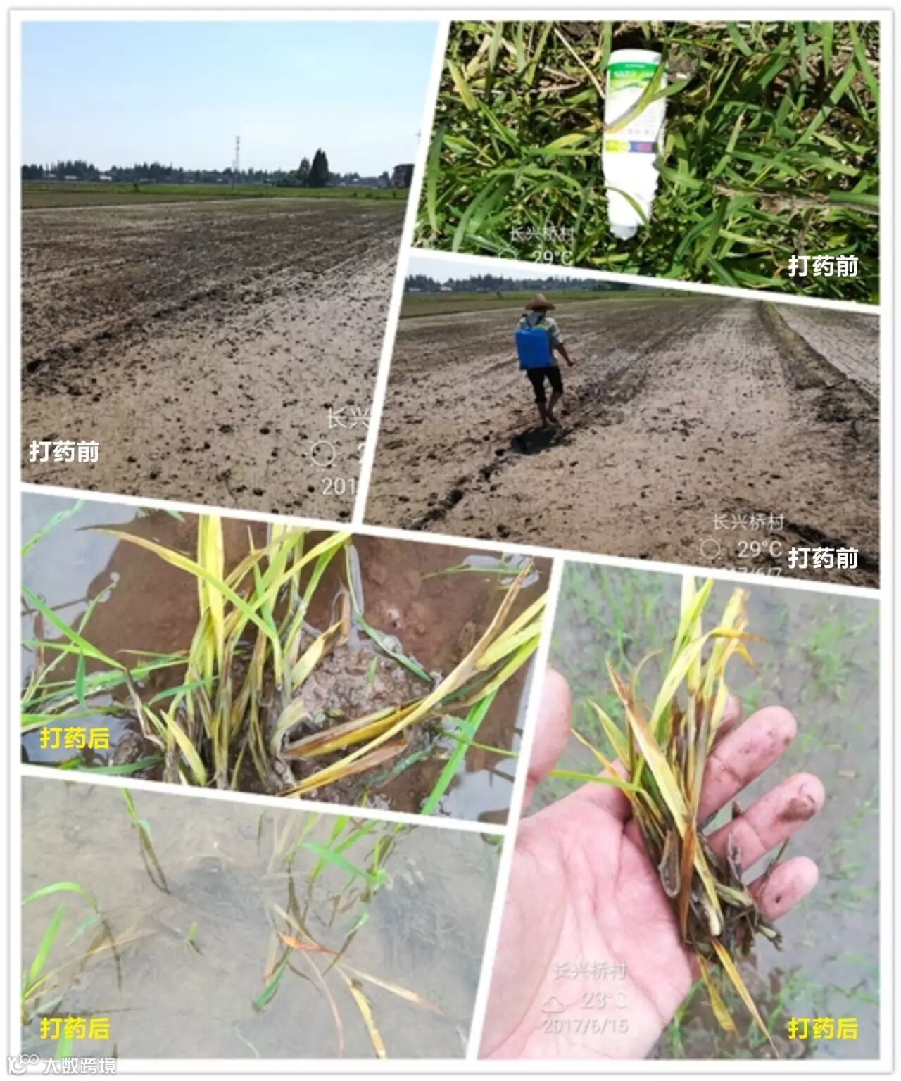 6月9号打药,田里禾苗在4叶-6叶不等,稗草千金子居多,这块田块据农户说每年除草成本很高,打了长山稻卫第6天去查看,效果令人震撼,千金子稗草大把大把的黄化枯死,据农户反应,打药后3小时左右就下雨了,第三天就看到死草了,没有丝毫影响药效。