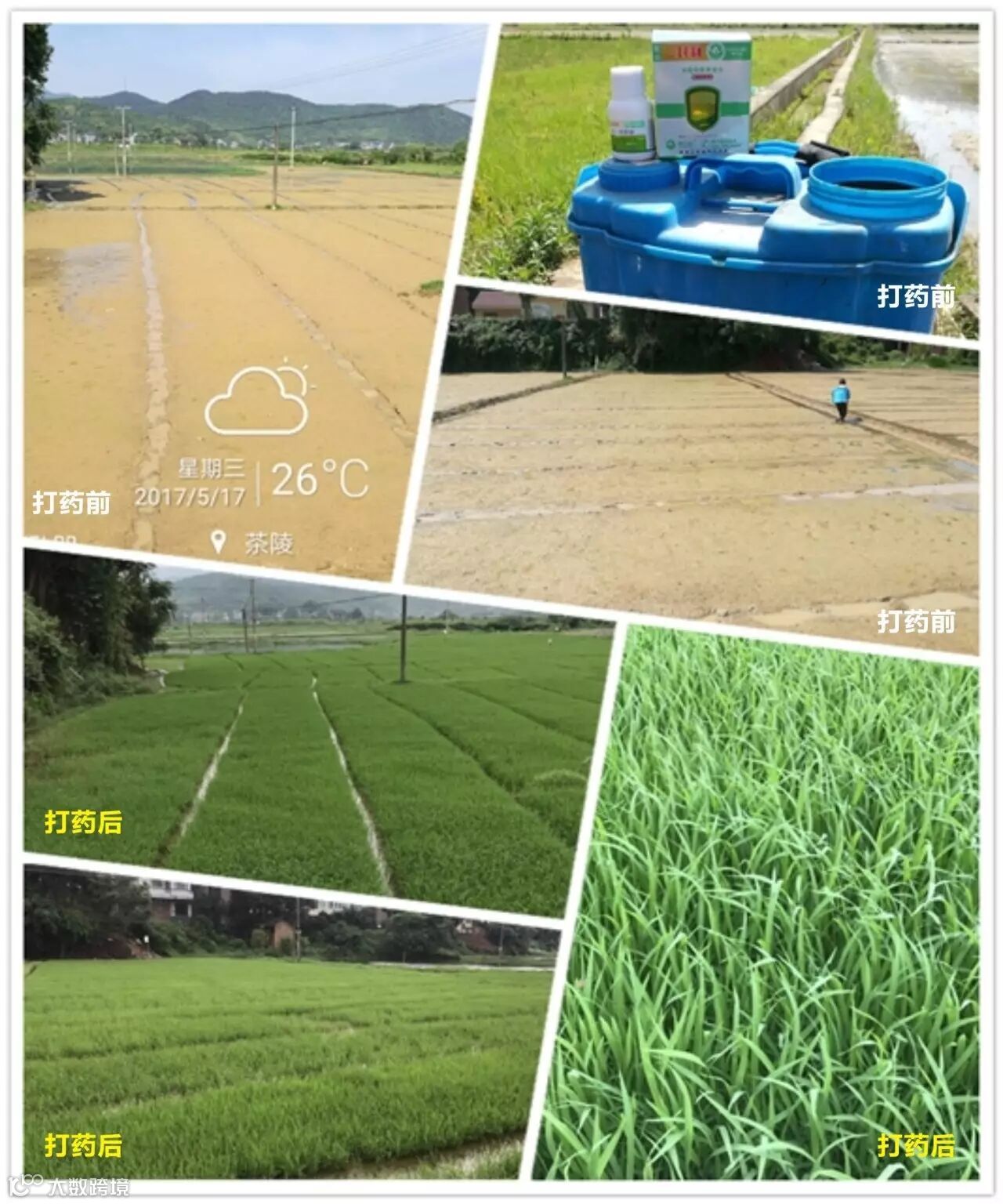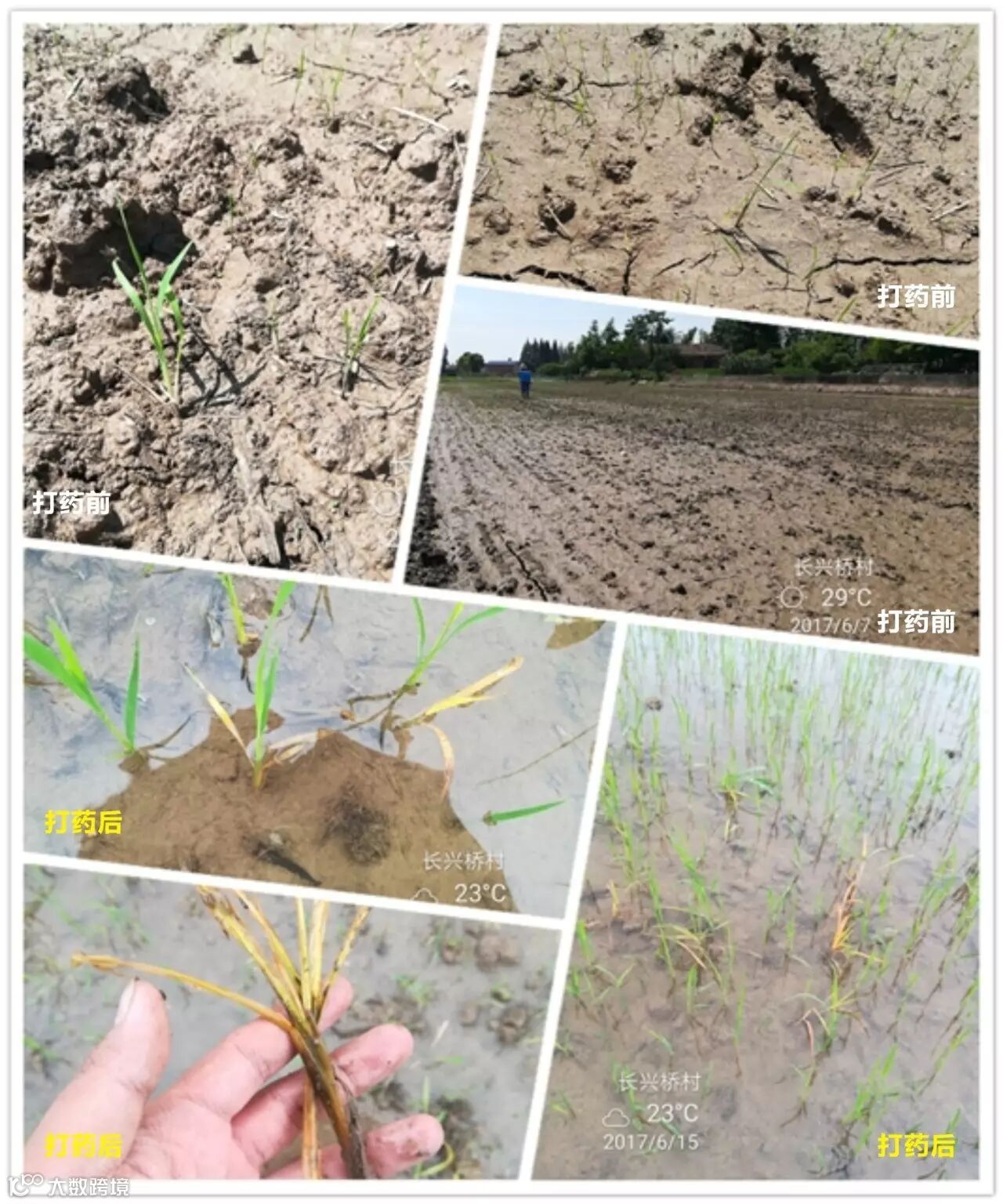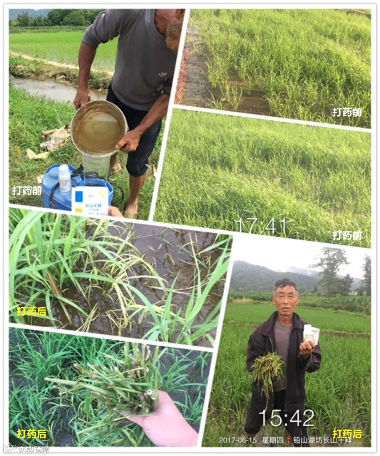 6月9号打药,田里禾苗在4叶-6叶不等,稗草千金子居多,这块田块据农户说每年除草成本很高,打了长山稻卫第6天去查看,效果令人震撼,千金子稗草大把大把的黄化枯死,据农户反应,打药后3小时左右就下雨了,第三天就看到死草了,没有丝毫影响药效。