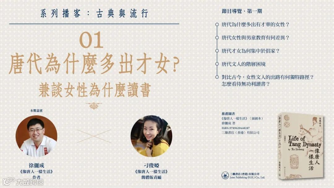 最近香港三聯書店出版了一本新書《像唐人一樣生活》(插圖本),這本書提供了詳細的唐代人生活的歷史細節,並以輕鬆、有趣又不失新知和教益的方式講述古今流行的話題,並順勢推出了「古典與流行」這檔播客節目,將不定期與各位讀者們聊一聊有關唐代的日常生活以及古今的流行文化。話題包括但不限於:唐代的生活與娛樂、家學與早教、法律與政治、身份與性別等等。本期先來聊一聊「唐代為甚麼多出才女」這個話題。