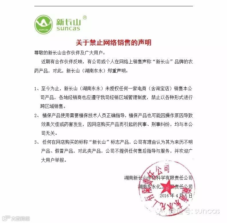 近期有合作伙伴反映,有公司或个人在网络上销售声称“新长山”品牌的农药产品,对此,新长山(湖南东永)郑重声明: