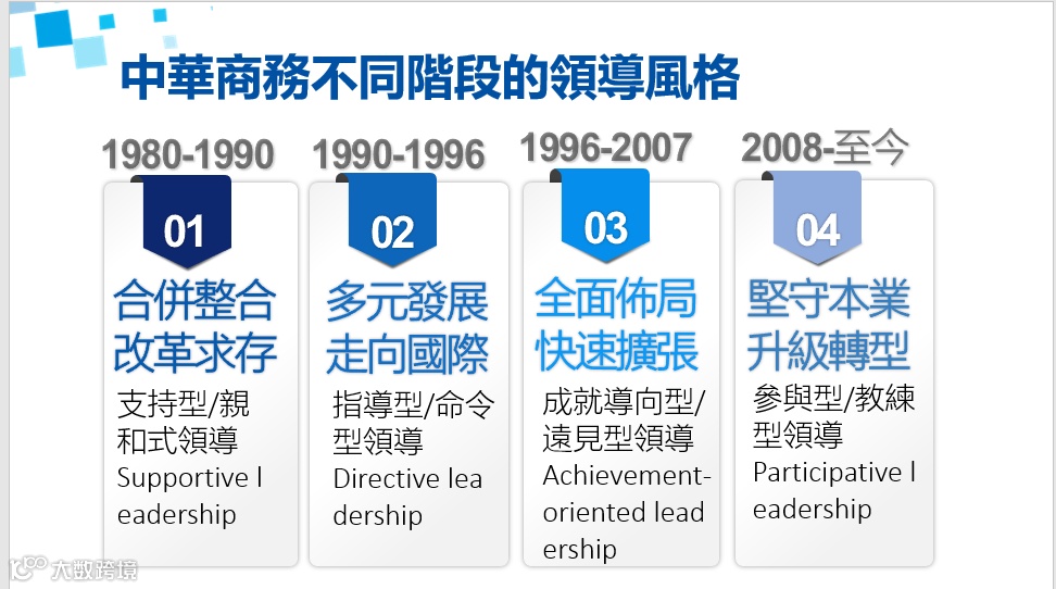 首先,梁兆賢先生將中華商務幾個階段的領導風格整合為四類:合併整合改革求存(1980-1990)時期是支持型/親和式領導(Supportive leadership);多元發展 走向國際(1990-1996)時期是指導型/命令型領導(Directive leadership);全面布局 快速擴張(1996-2007)時期是成就導向型/遠見型領導(Achievement-oriented leadership);堅守本業 升級轉型(2008-至今)時期是參與型/教練型領導(Participative leadership),而梁兆賢先生自己就是參與型領導,能夠與下屬一起進行決策,鼓勵下屬參與決策,通過過往跟隨這些領導的深入了解和探討,不斷學習鑽研,將不同時期的領導風格簡化歸納,並希望大家在日常生活中能有效運用。