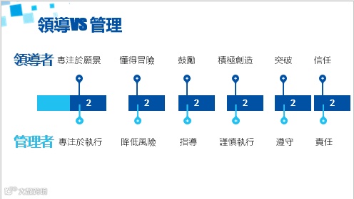 領導者與管理者有同也有不同,他們的共性在於總體的目標是一致的,都需要計劃和決策,前者是長遠宏觀,後者是中短期微觀。梁兆賢先生將其不同處歸結為六點。