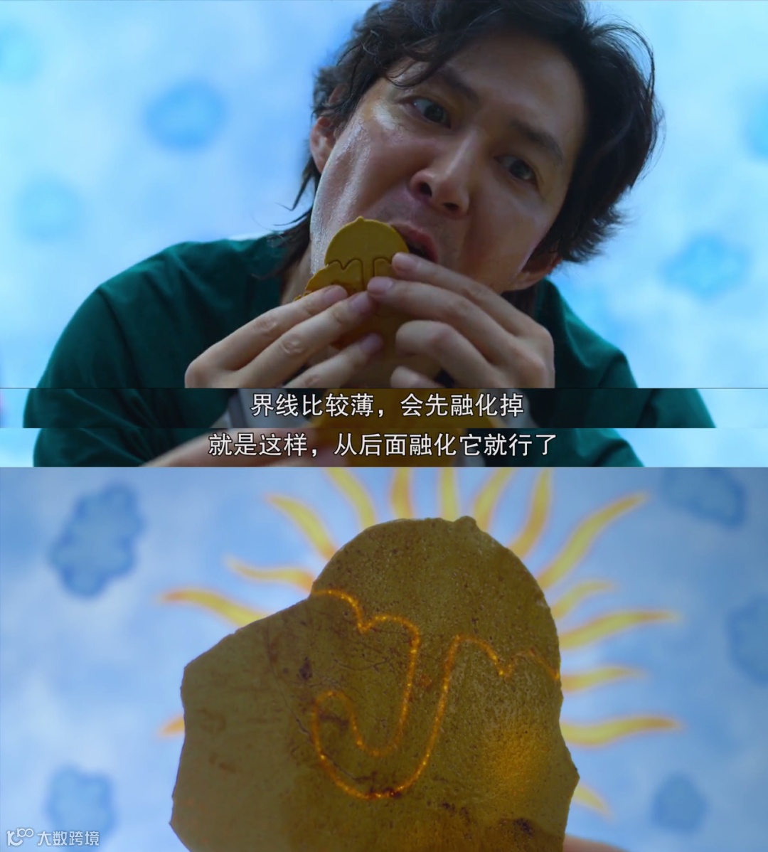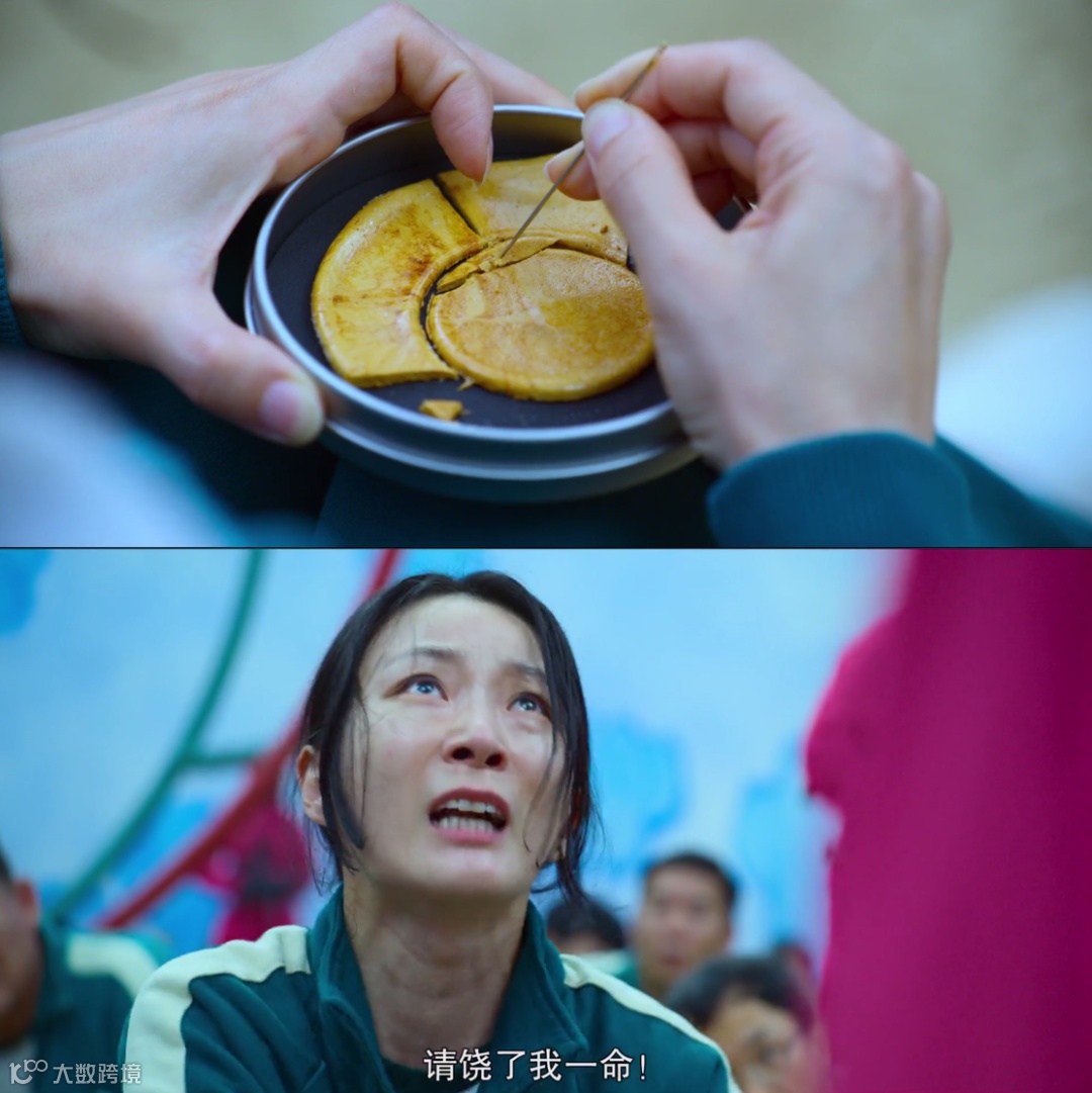 顶着看巨大的压力,男主角无意中发现自己的汗水能够融化糖饼。举一反三,他通过舌头舔拭来迅速融化图形边缘较薄的部分,最后在时限内顺利完成了游戏目标。而许多拿到“伞形”糖饼的选手,他们明知不可为而硬为之,最终有79人在“死胡同”里走向了自己的末路。