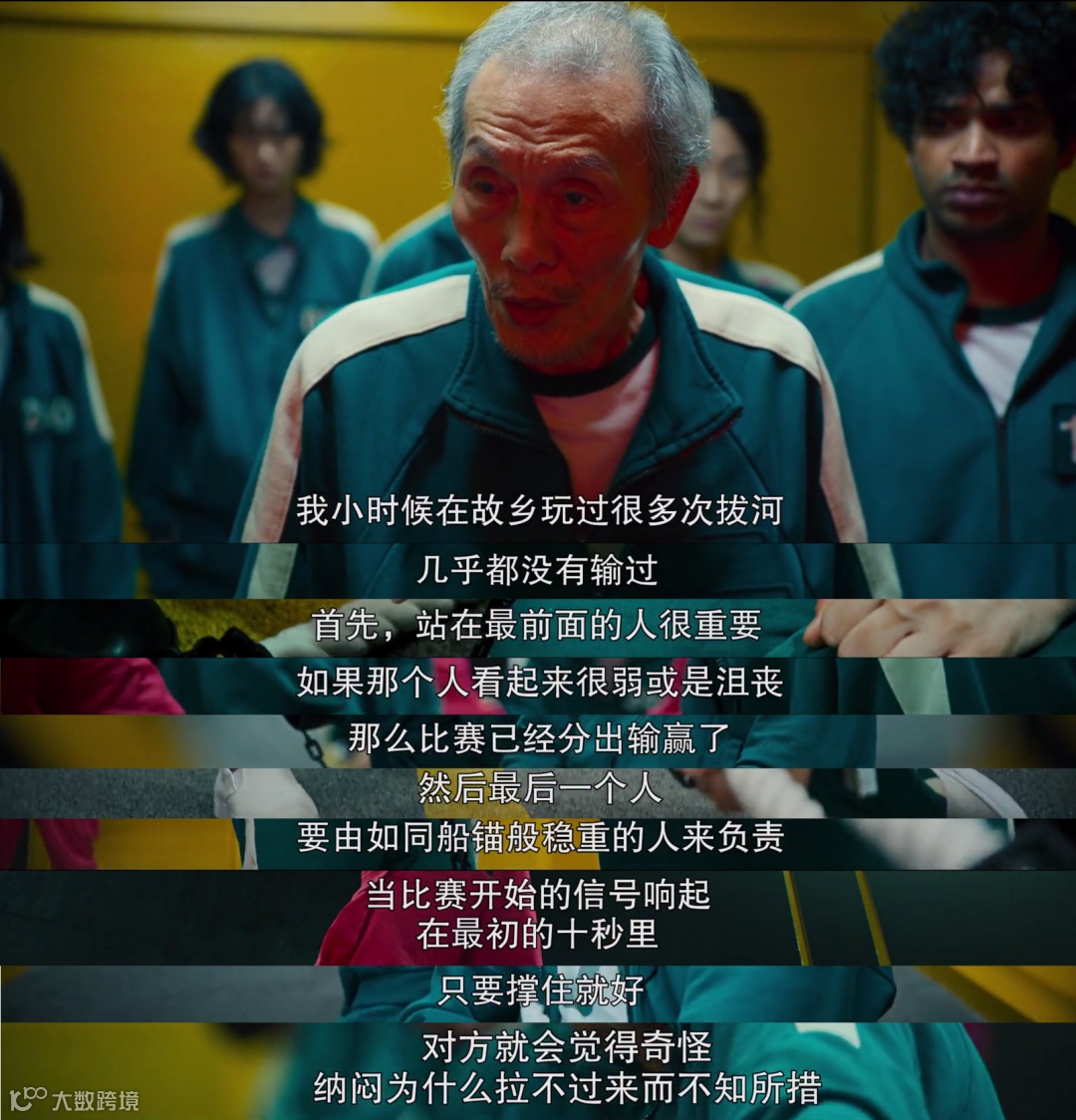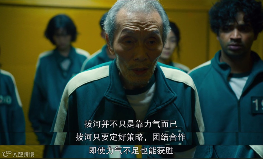 众所周知,拔河是一项比拼“力量”的游戏,但有意思的是:剧中其他几支队伍都竭力拉拢男性加入,增强力量。只有男主角这一队,不仅女性最多,还有老人和残疾人,几乎必死无疑。