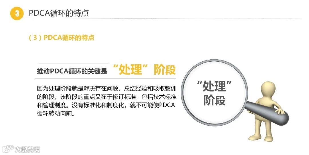 3、A断环:处理环节,是PDCA最重要的阶段,也是提升的关键。事情做完了,一定要总结复盘,一定要回顾过程和结果,总结经验和教训,固化成果。