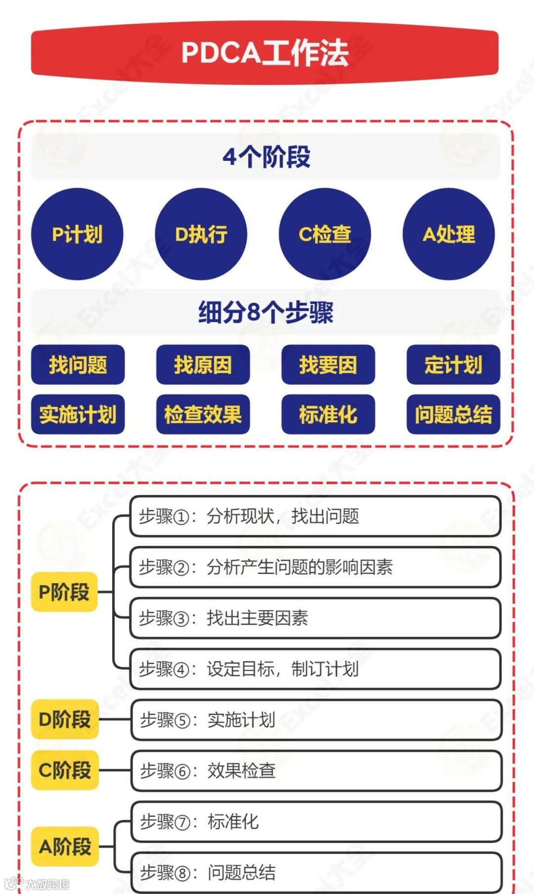 附图为PDCA的4个阶段8个步骤的思维导图和PPT,分享与你!