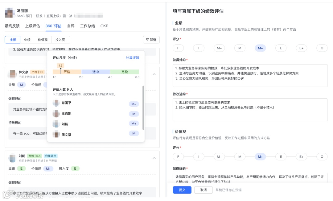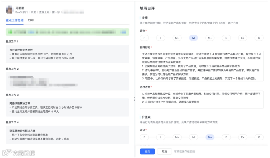 现在,已经有了冯丽丽的OKR内容,工作总结,别人对她的360评估,她的自评,信息比较充分了。然后,我就可以根据这些信息,来综合判断,给她打分。