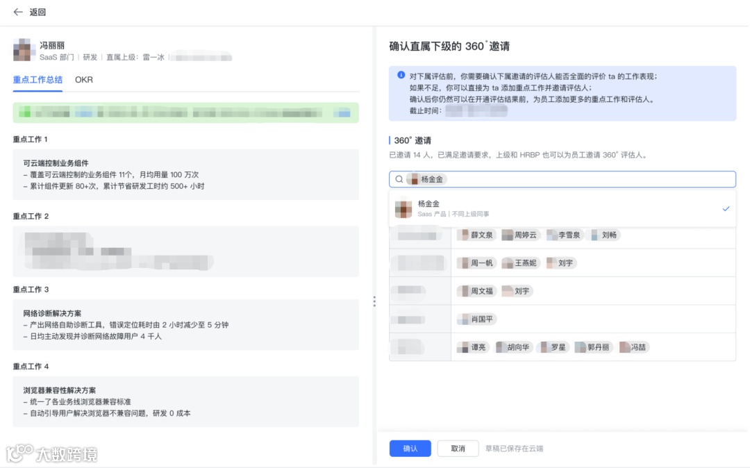 所以,下属给周围的人发送360邀请之后,上级也可以帮助这位同学邀请更多的人一起来评估,再做一次确认。