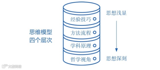 成甲在其所著的《好好思考》这本书中,将思维模型分为了四个层级,从低到高分别为:经验技巧、方法流程、学科原理、哲学视角。