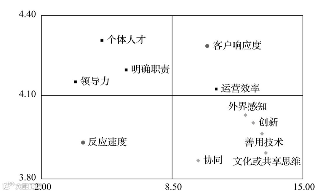 在2016年所做的HRCS中,我们找到了11个能够指引或影响组织表现的基本组织能力。我们对11项能力做了因素分析,并把它们归为三类,从它们对业务结果的影响度和表现优异与否方面做了一幅矩阵图,在这幅矩阵图中,我们依然将它们分到了三大能力类别中。