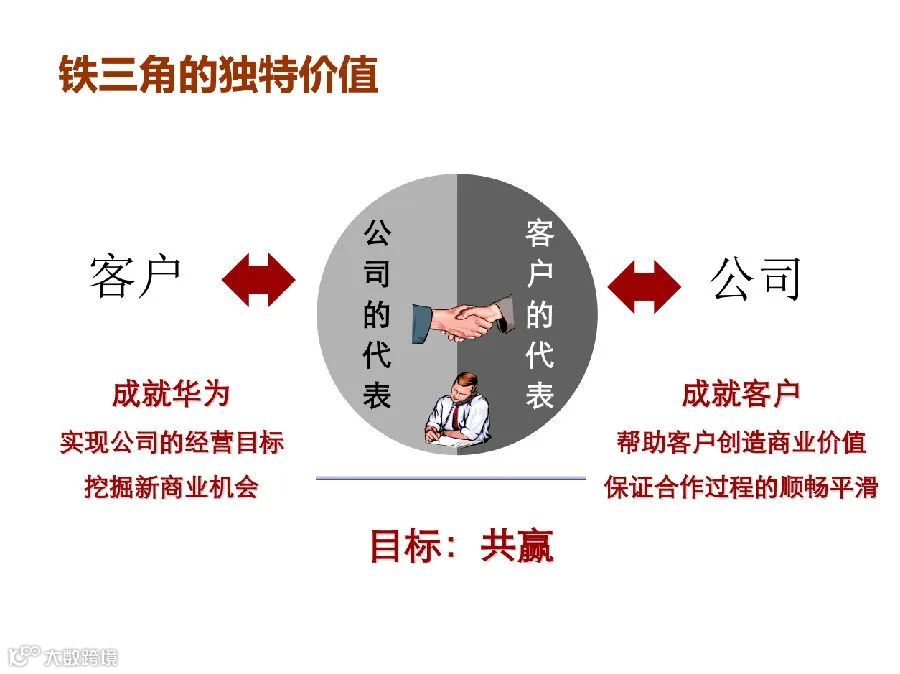 所谓“铁三角”,就是真正面向市场端的是客户经理、解决方案专家、交付专家,前端针对某一个客户,依据这三类人来做决策。
