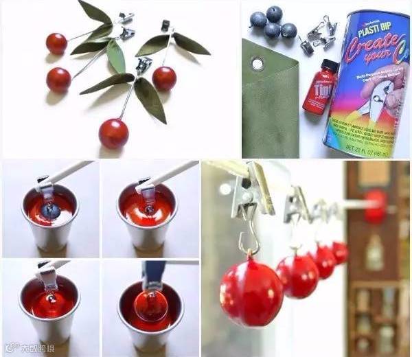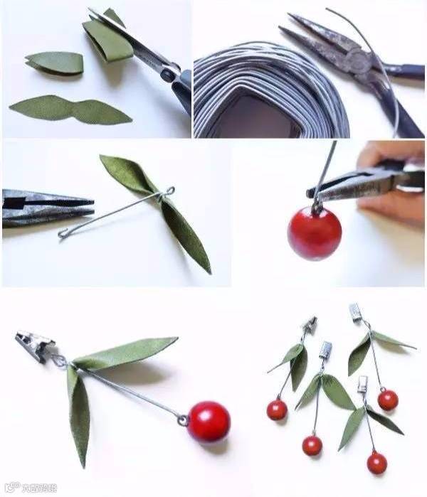 ▼再用绿布剪出绿叶,拿铝线绑起来,串上“红樱桃”和窗帘夹