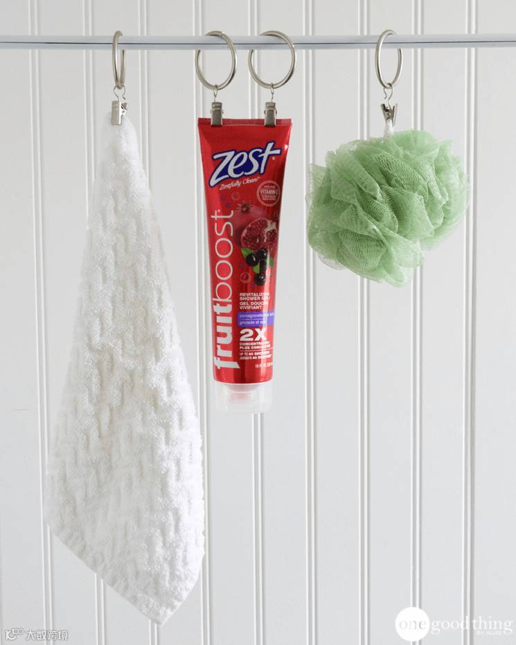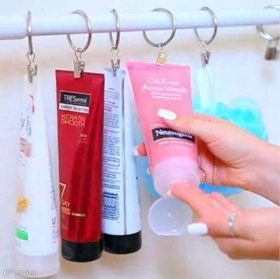 ▼你总觉得浴室空间不够大,东西永远没地儿放,添根杆子,浴巾毛巾洗面奶都可以用窗帘夹!挂起来还干燥的快,再也不怕浴室水汽多了容易发霉
