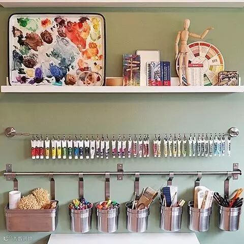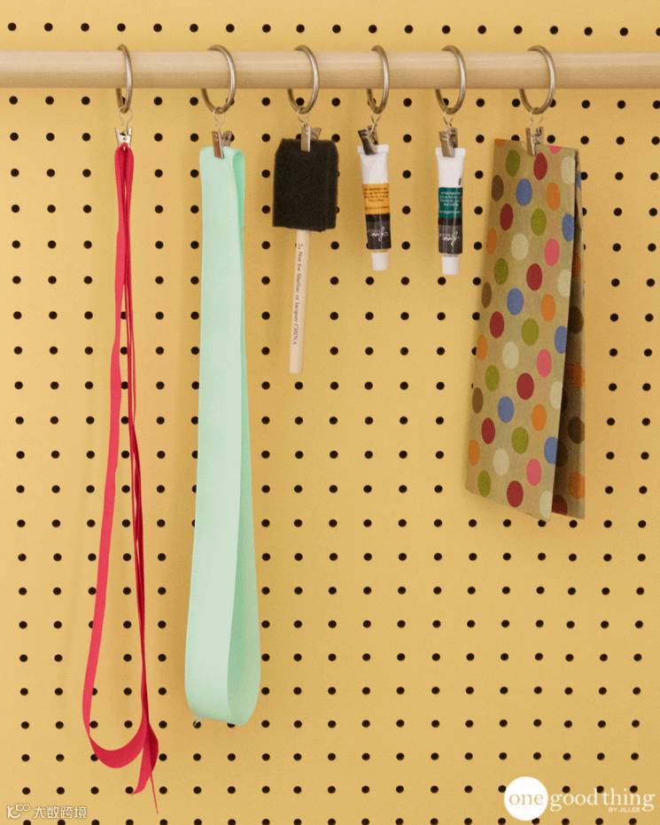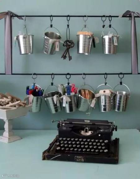 ▼文具用品放抽屉里乱糟糟,一个一个挂起来,看起来都井井有条,挂个小桶当笔筒工具筒,分类清晰,用起来不怕找不到