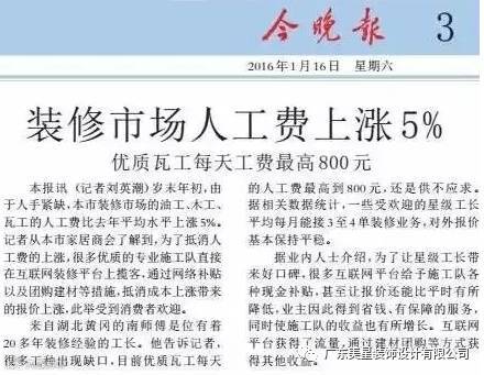 根据目前市场行情,泥工、木工、油漆工等装修工人的人工费都比去年上涨了5%-10%左右,而这样的涨价明年更甚。