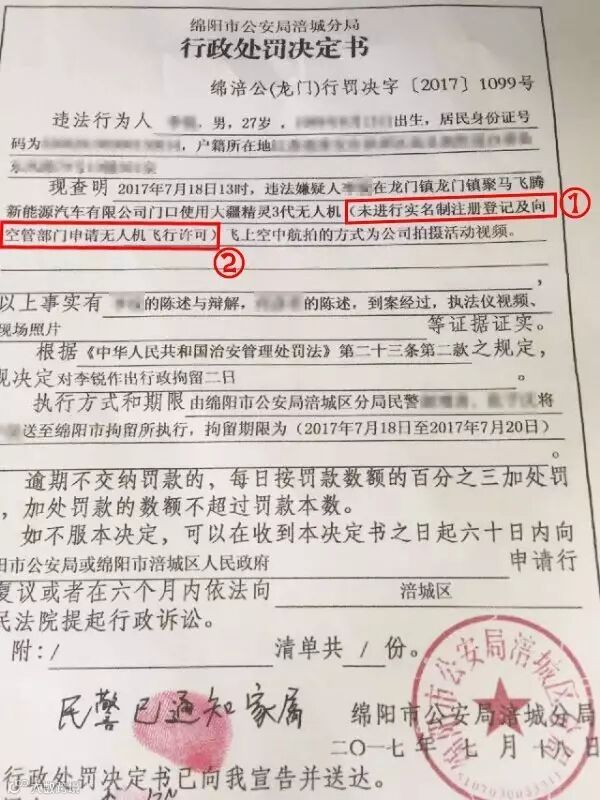 一份无人机玩家被公安局拘留处罚的《行政处罚决定书》在圈内广泛流传,为了保护个人隐私,我们已将个人信息部分打了马赛克处理,处罚决定书如下: