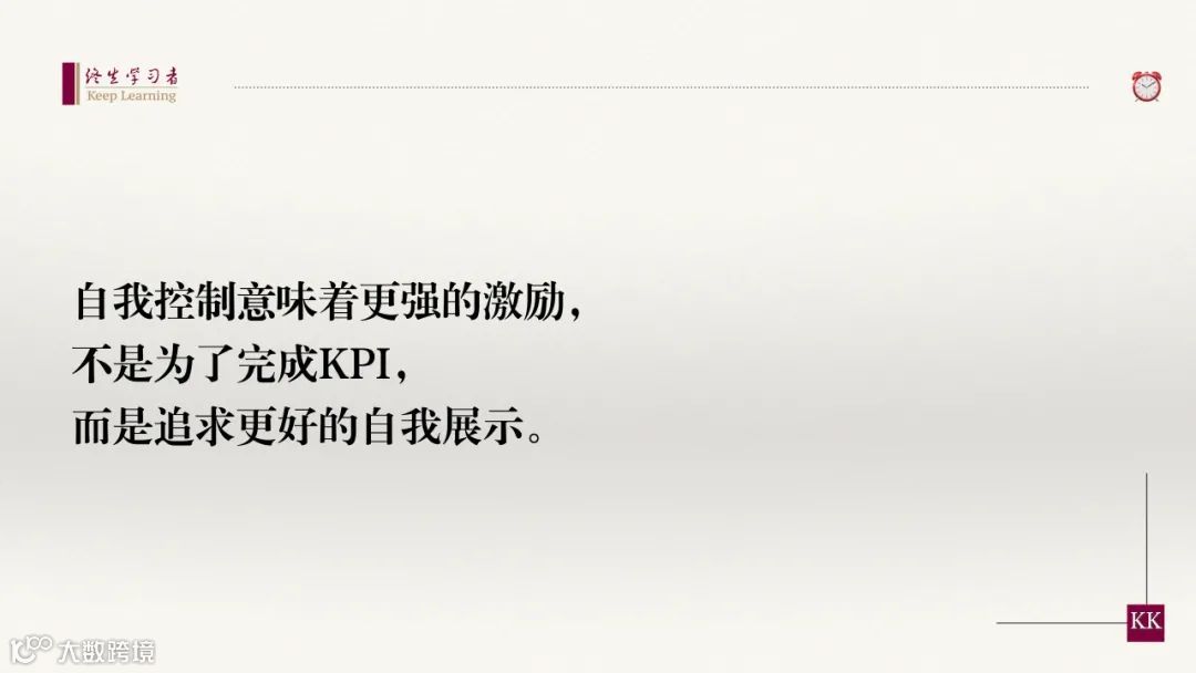 自我控制意味着更强的激励,不是为了完成KPI,而是追求更好的自我展示。它是一种尽己所能而非敷衍了事的强烈愿望,它还意味着更高的绩效目标和更宽广的视野。