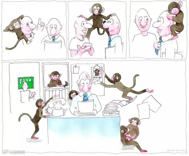 于是,你的身上爬满饥饿的“猴子”,吵吵闹闹地等待你喂食,你所有工作时间都被下属甩给你的“猴子”占据了,还不停地监督你的工作: