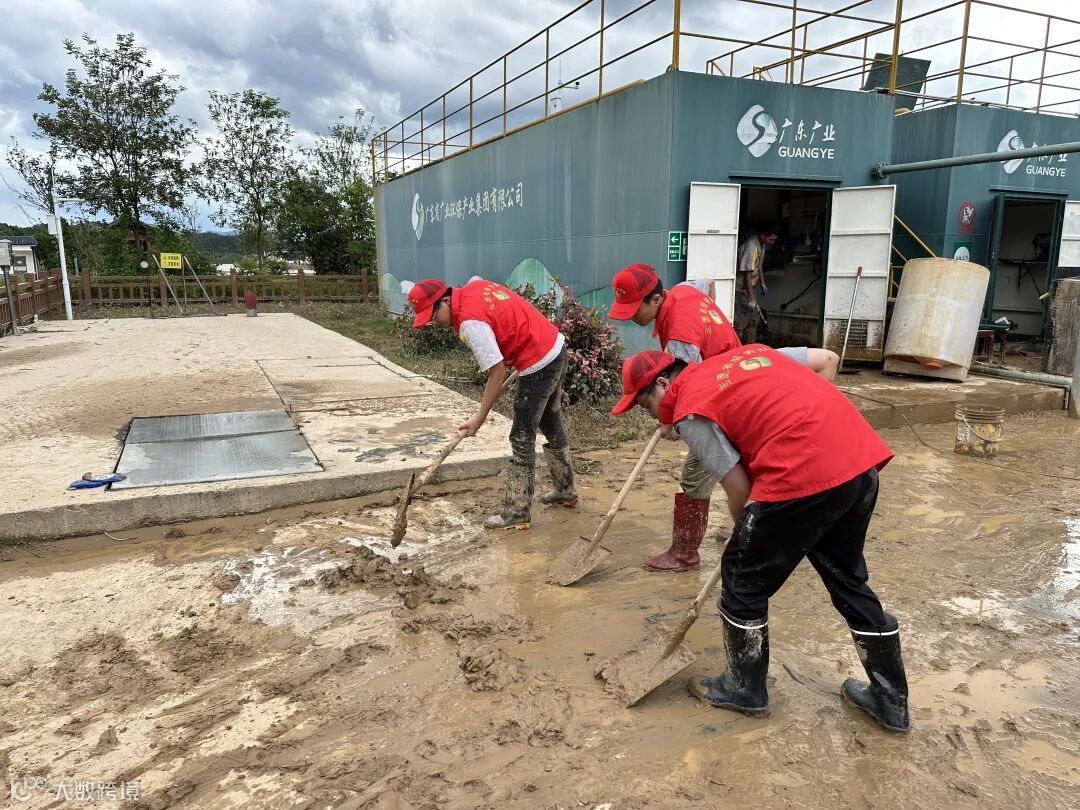 泥巴裹满裤腿,汗水湿透衣背,面对高强度的清淤消毒和设备检修,在广业环保梅河区域中心党员团员青年迅速转战灾后抢修复产任务中,他们以小组为单位分工协作,有的清除淤泥、有的整理被泡物资、有的擦洗机电设备、有的环境消毒等,确保不留死角,不留盲区。