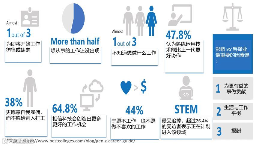 这个时代,年轻人已经不愿意加班做无意义的工作,他们需要使命感、人生意义。根据统计数据显示,影响95后择业的前三大因素中,薪酬位于最后。前两位分别是“为更有意义的事做贡献”和“生活与工作平衡”。