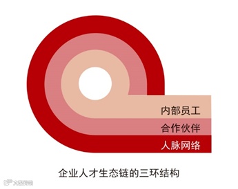 很多企业都非常重视自身人才队伍的建设,也就是内部人才的选拔、培养、使用和激励,但是往往忽略了企业业务生态发展的关键要素——人才生态。人才生态是一个三环结构,分别代表了企业内部员工、周边合作伙以及外部人脉网络。
