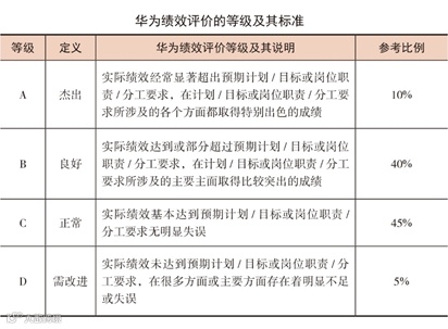 其次,在考核中,华为坚持兑现A占10%、B占40%、C占45%、D占5% 的基本比例。华为有接近一半员工的考核结果是C。