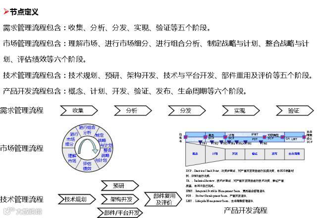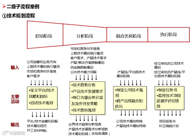 技术规划制定公司的关键核心零部件发展规划;技术管理流程包含:技术规划、预研、架构开发、技术与平台开发、部件重用及评价等五个阶段。