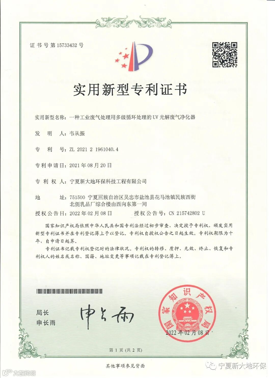 热烈庆祝宁夏新大地环保科技工程有限公司“一种用于海绵城市的透水砖”、“一种工业废气处理多用级循环处理的UV光解废气净化器”实用新型专利获得国家知识产权局授权,并取得专利证书。
