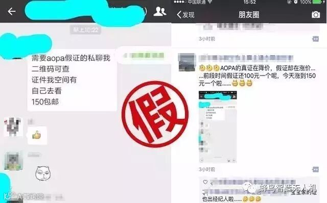 2016年,在微信群及微信朋友圈就有人开始明目张胆兜售假的“飞手”证。不仅直接了当说自己办的是假证,还标榜仿真度高等“宣传语”,而每张假的AOPA飞手证更是被卖到了150元一张。