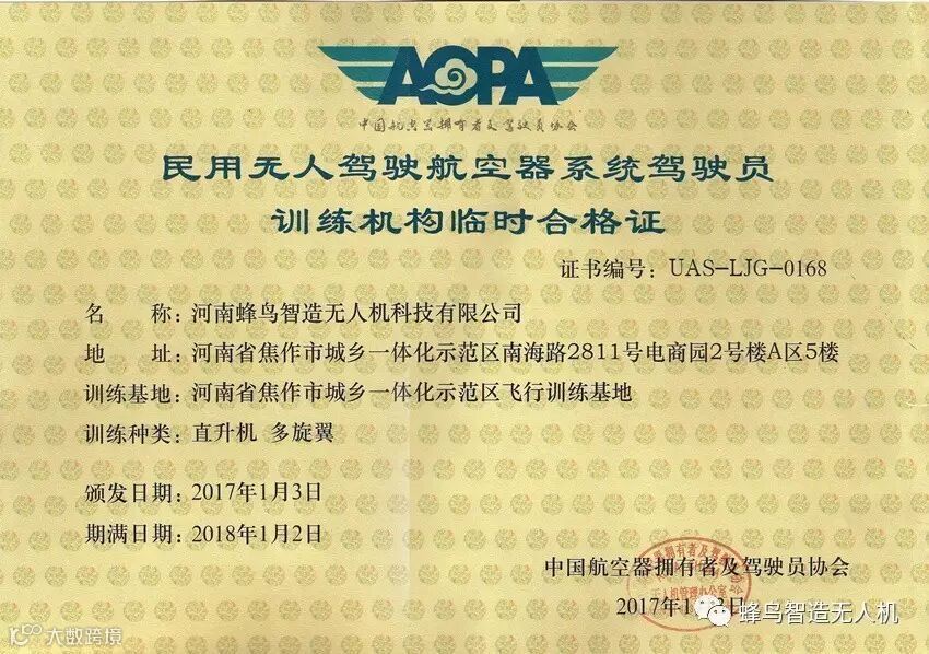 河南蜂鸟智造无人机科技有限公司是AOPA审定合格的无人机驾驶员训练机构,新一期培训班正在火热报名中,敬请垂询热线4000-327-658