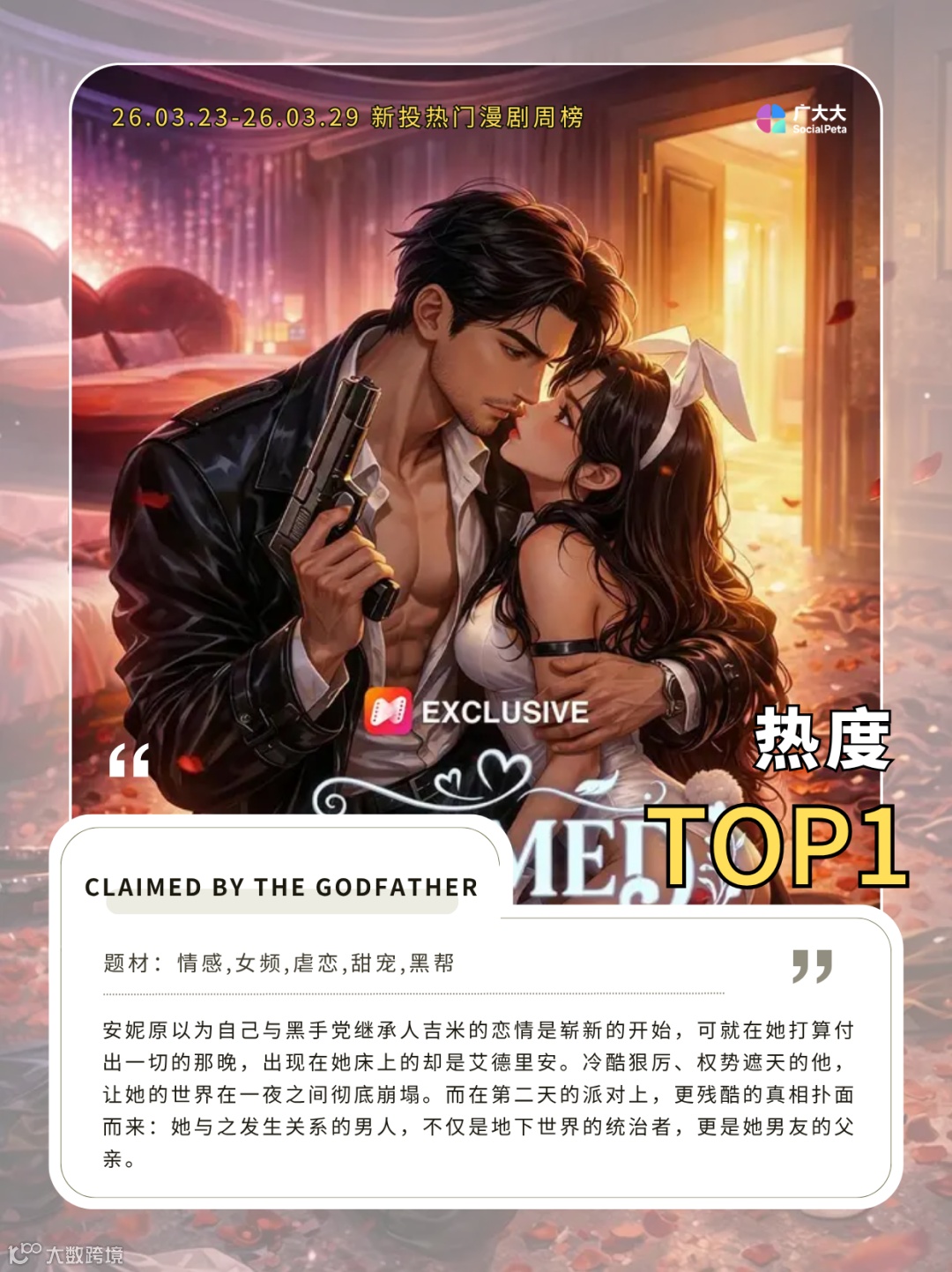 接下来我们来看看本周热度排名第一的《CLAIMED BY THE GODFATHER》(中文名:暗夜猎心),该剧主投【NetShort】,目前去重创意数约1.55K,热度值超7.9W,多版本合计热度约11W,在本周热门漫剧总榜中排名第六。除了热度最高的英文版外,还有葡萄牙语、韩语、泰语等约19个版本在投。