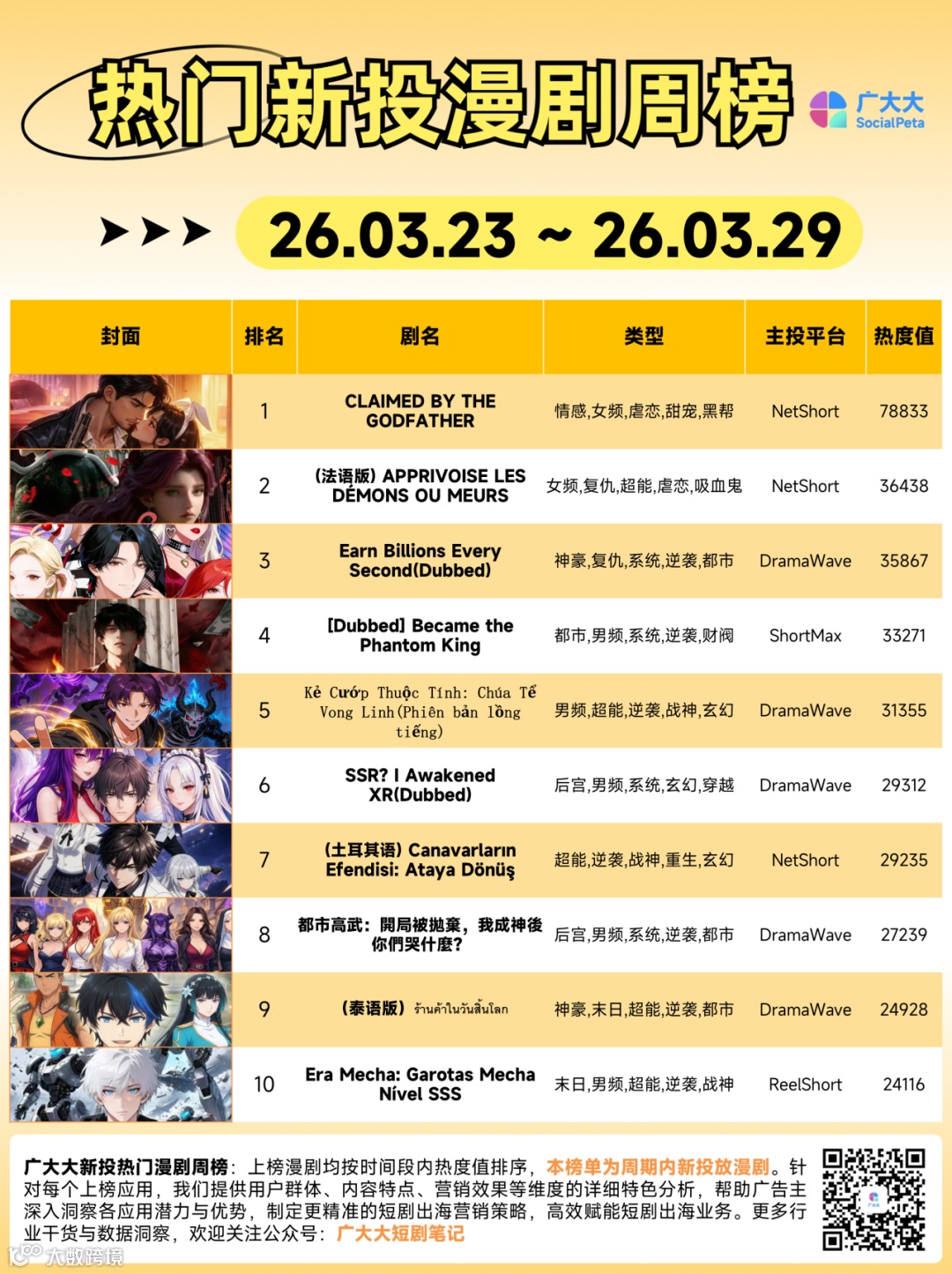 本周(2026.03.23-2026.03.29)新投放漫剧约590+部,相比上周略有降低。上榜TOP10的漫剧中有多部为之前上榜过的漫剧的小语种版本,例如第2、第7以及第9的漫剧,他们针对的地区各不相同(例如法国、土耳其和泰国等),这也说明全球化多语言布局已经是漫剧出海的重要增长路径之一。