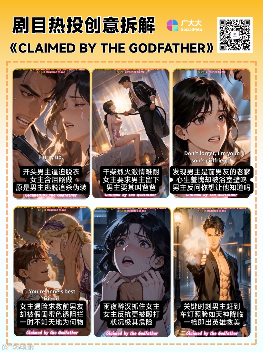 该剧为之前已经在海外验证跑通的帮派+虐恋甜宠的黄金题材,以黑手党家族+禁忌恋为背景,开篇就用 “错睡男友父亲” 制造巨大戏剧反转,既有黑帮霸总的强苏感,又有背德、复仇、身份落差等高刺激元素,情绪钩子极强。
