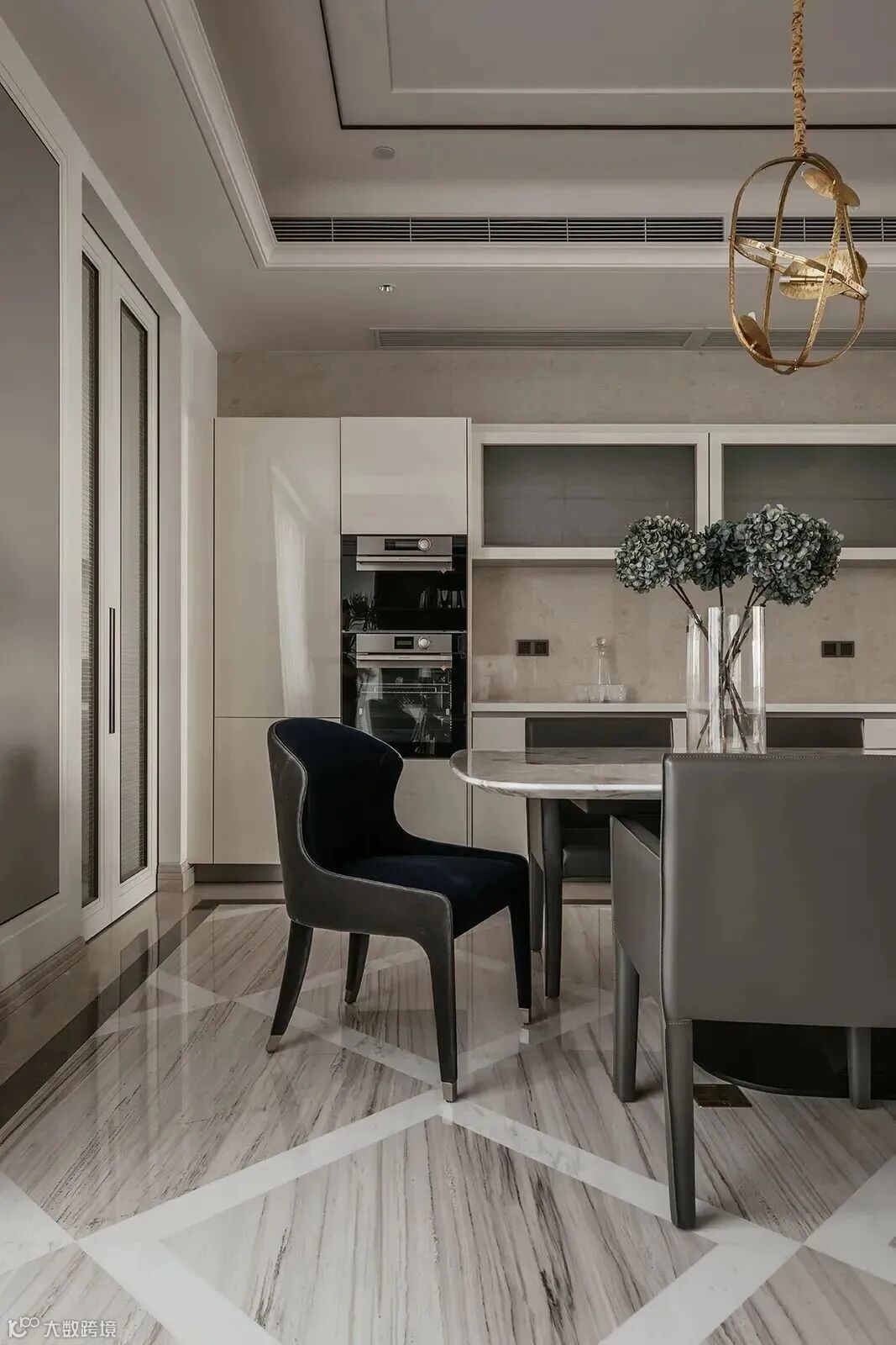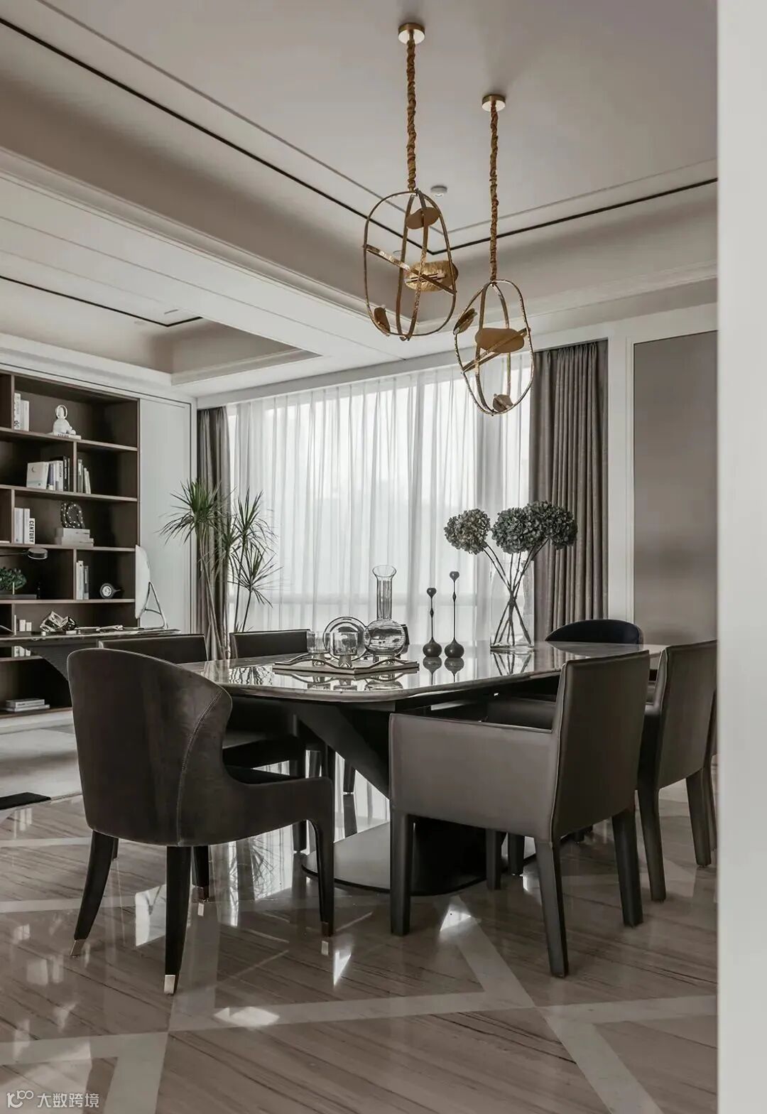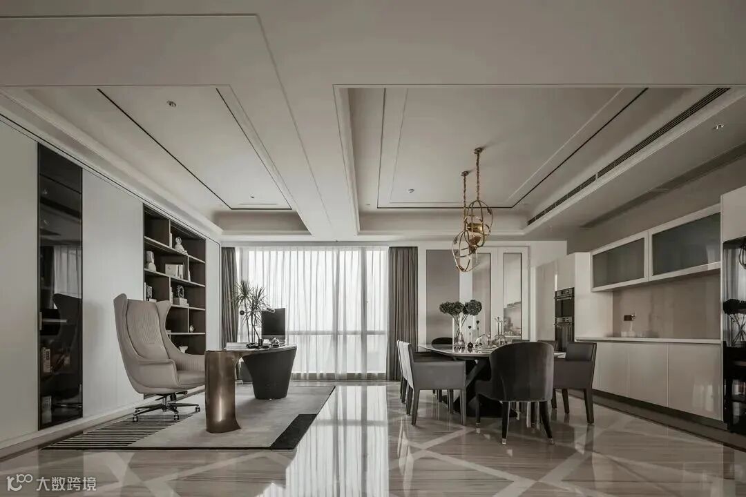 书房、客厅和餐厅位于同一个空间,层次感强烈,将几个空间的采光集于一体,书房的书柜和墙壁一体化设计,加上精致的摆件来进行装饰,体现出了屋主人的高级品味。