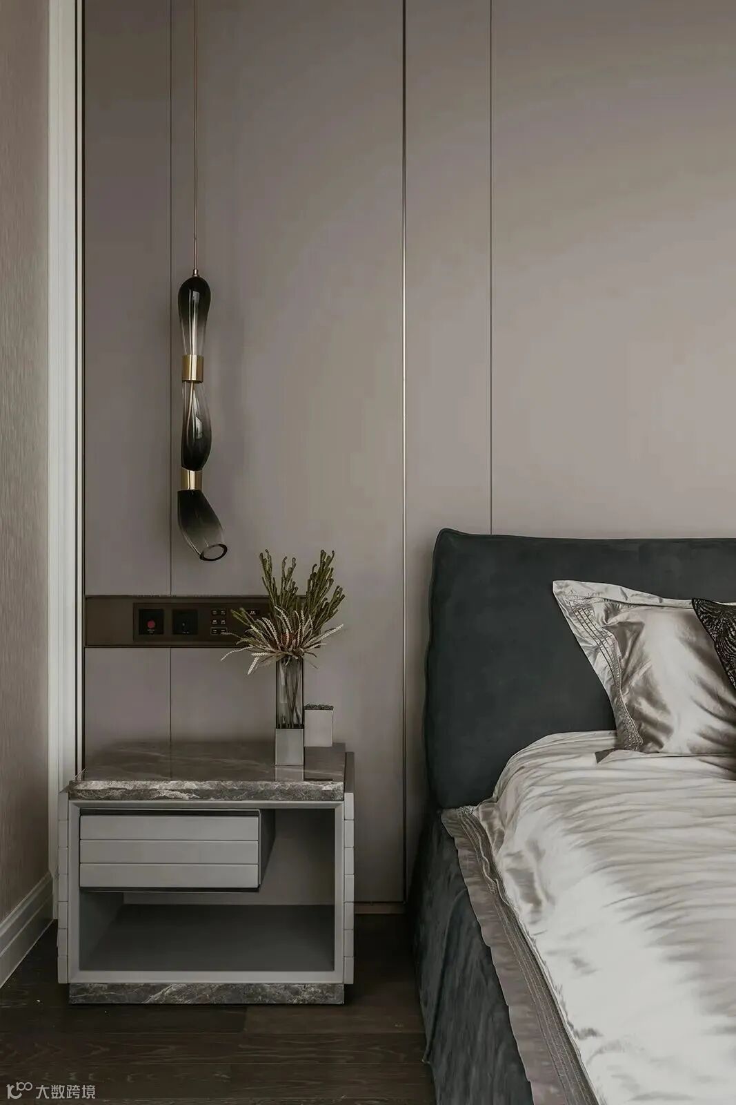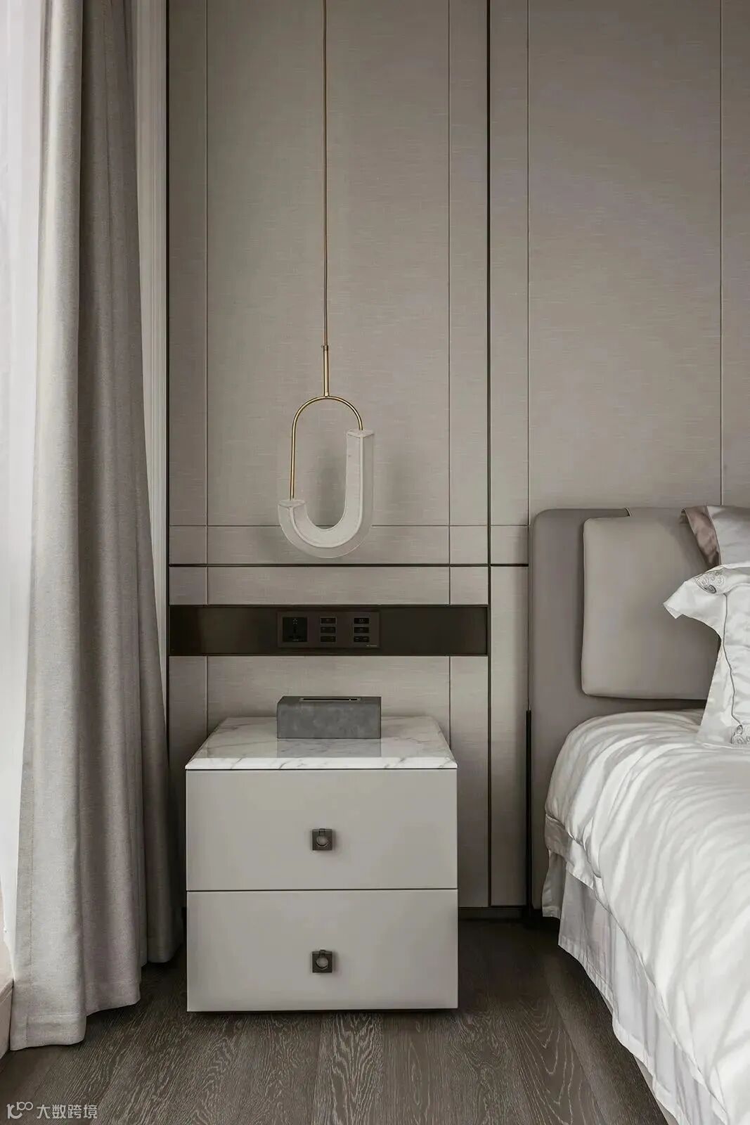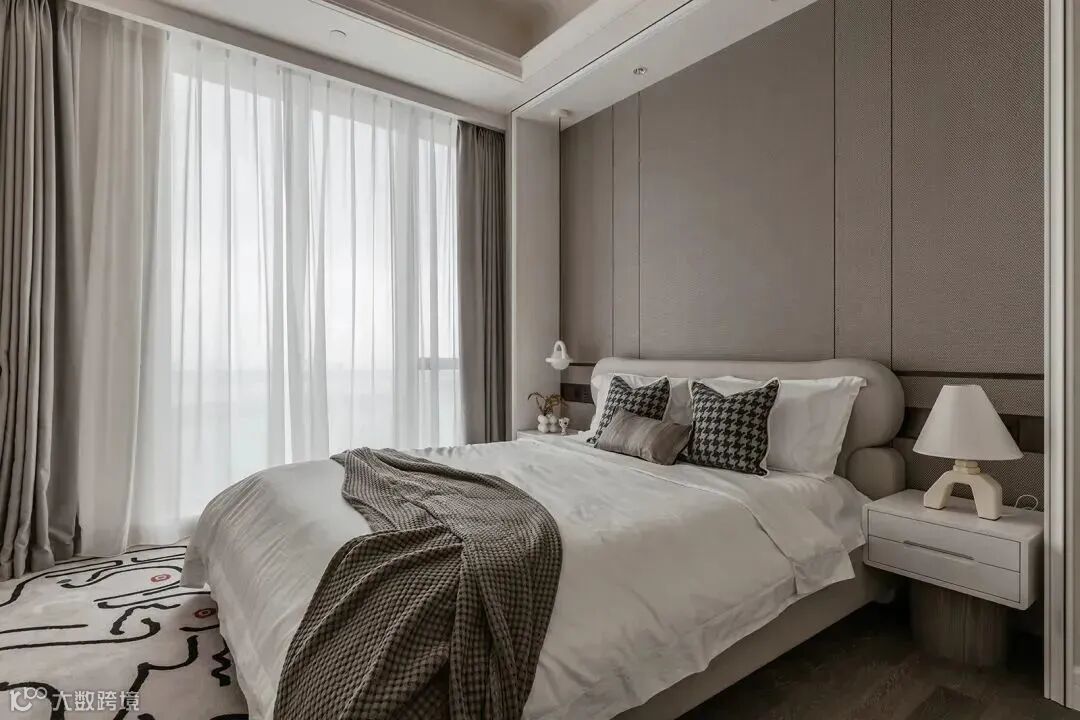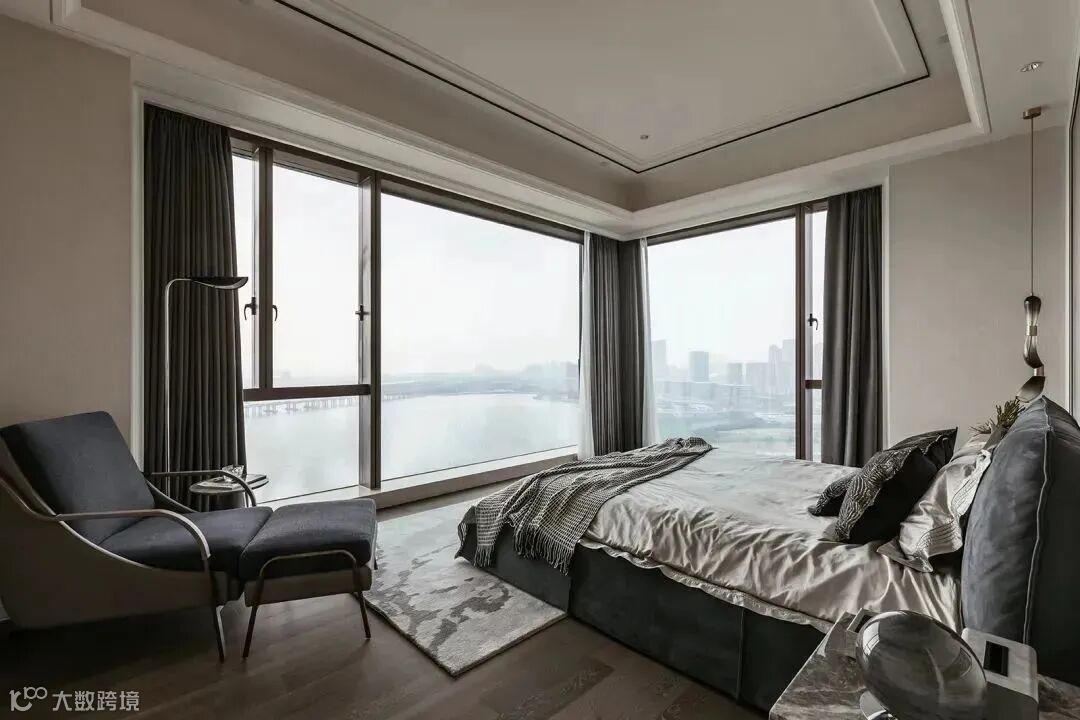 卧室两面墙壁都采用落地窗,有着良好的采光,也能享受到窗外的极致海景,细致的纹理加上丰富的图饰,能抚慰一天忙碌的疲惫,带来闲适和安眠。