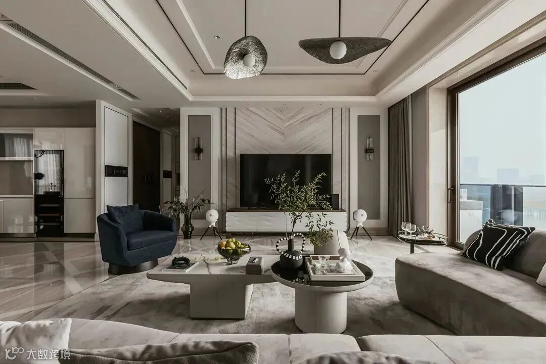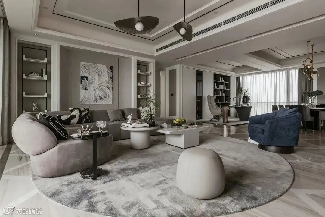 客厅的动线流畅,圆形的地毯作为分割,是家庭的核心区域,给人带来舒适感,加入蓝色来进行调和,增加这里的张力,让室内更加多元化。