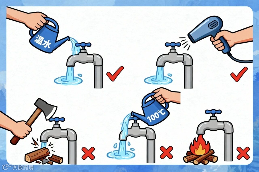 温水解冻。对已冰冻的供水设施,宜先用热毛巾裹在水龙头上,浇温水使其解冻。拧开水龙头,用温水沿水龙头向管道浇淋,使水管解冻。若浇至水表处仍无水流出,再用热毛巾包在水表上,用温水浇淋,切勿用开水激烫或用火烘烤。