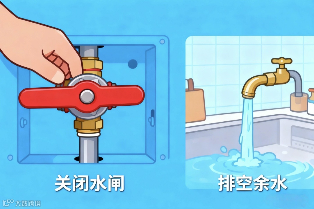 关闭阀门。家中长时间不用水时,应将自家水表后的进水总阀关闭,并排空水管中的存水及太阳能热水器中的余水,防止用水设施冻破时因家中无人造成不必要的损失。