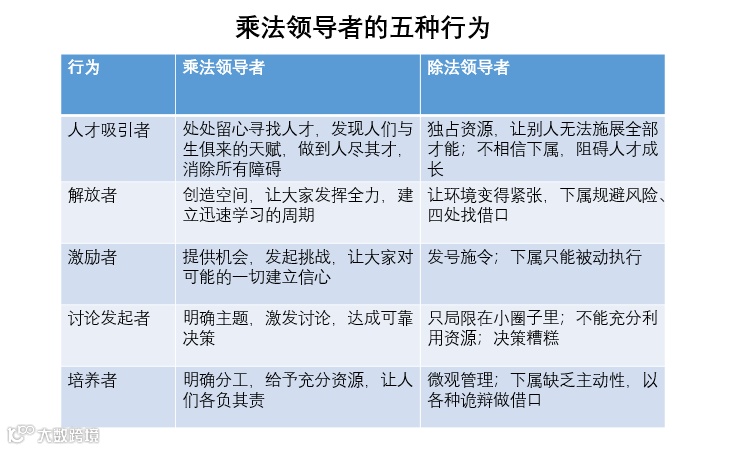乘法型领导者注重培养身边人的才智发展,而除法型领导者则把他人的才能视为自己事业发展的垫脚石。