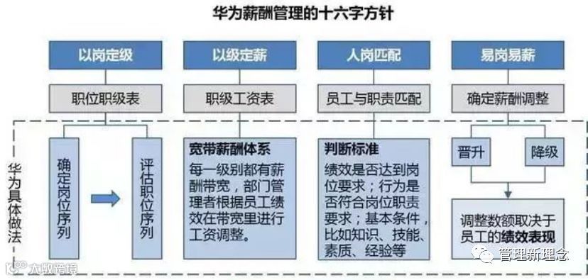总体来讲,可以用16个字来概括华为的薪酬管理:以岗定级、以级定薪、人岗匹配、易岗易薪。