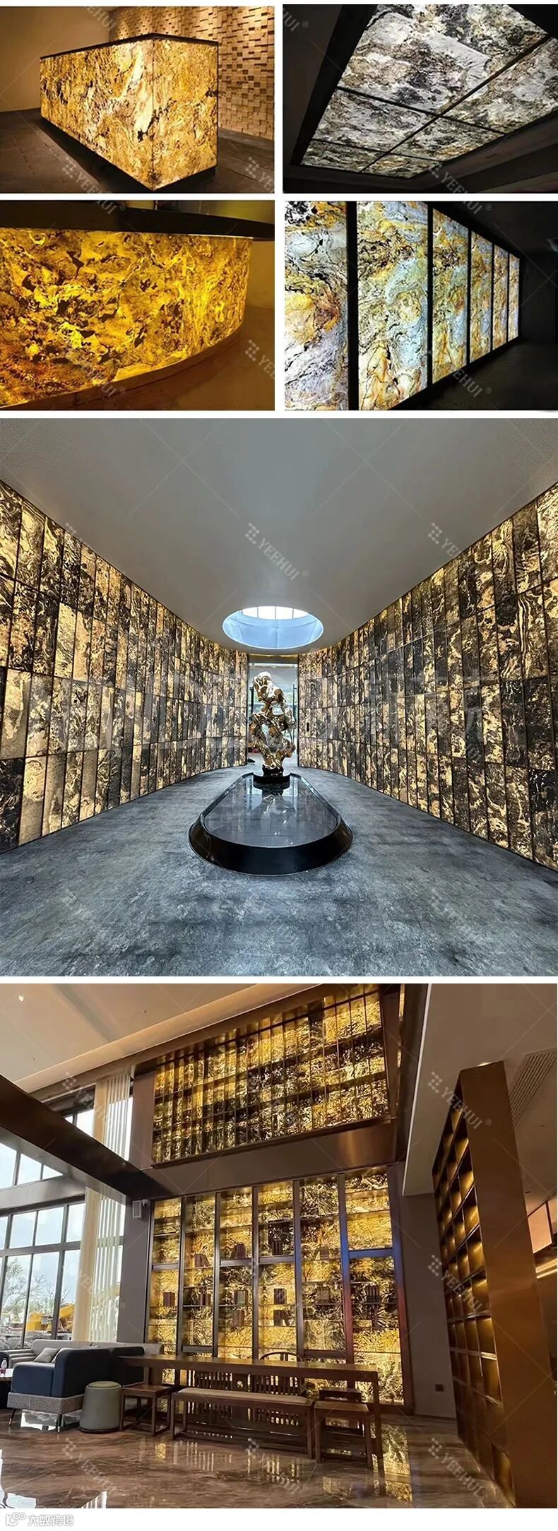 发光大理石背景墙通常采用天然石材板材制成,无毒无害,符合现代社会的绿色装修理念。同时,其优异的耐用性和抗腐蚀性也保证了它能够在长时间内保持美观和光泽,为室内空间提供持久的装饰效果。提升品牌形象:
