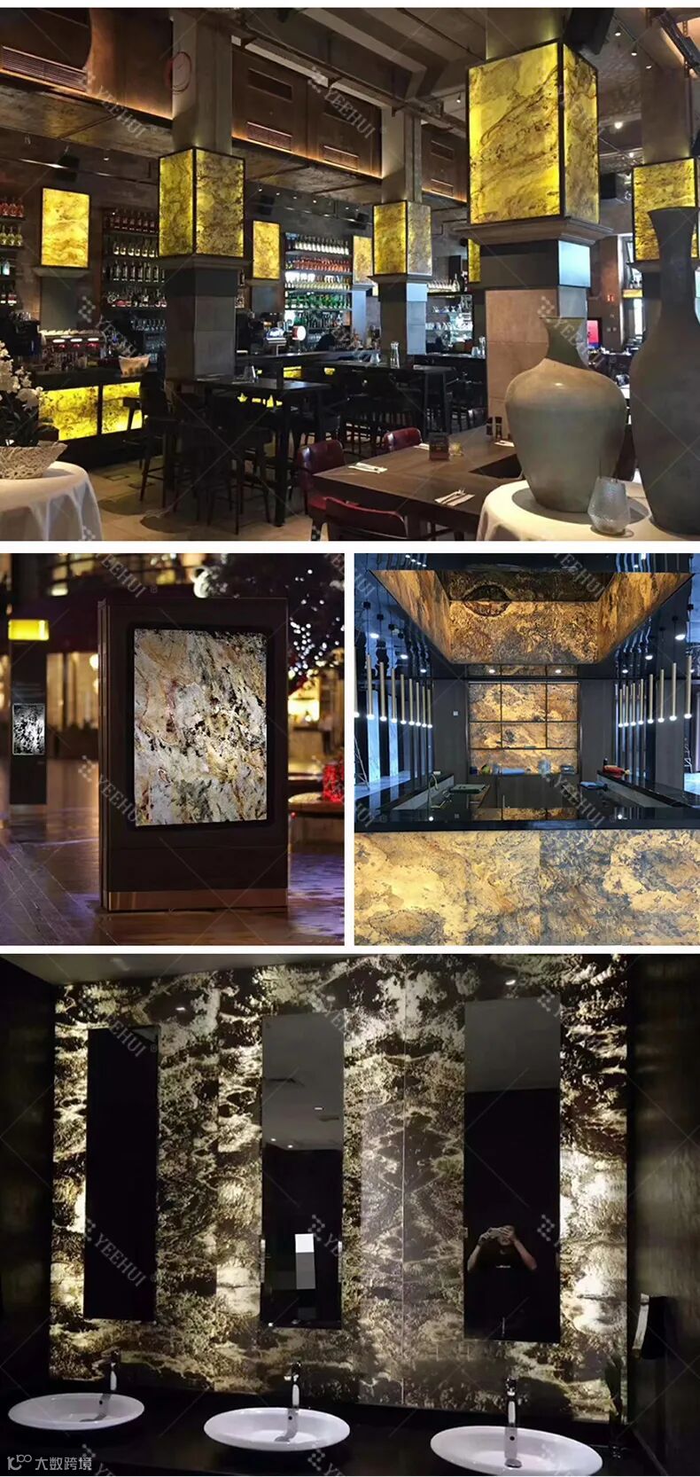 发光大理石背景墙在黑暗中能散发出柔和而持久的光芒,为空间增添了一种神秘、浪漫的氛围。其天然石材的纹理与光影交织,形成了一种独特的美学效果,使得整个空间更具立体感和层次感。创新的设计元素: