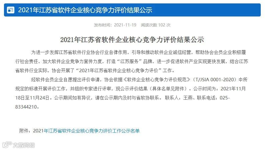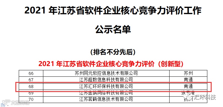 近日,江苏省软件行业协会对外正式公布了2021年江苏省软件企业核心竞争力评价结果。汇环科技凭借雄厚的技术实力与自主创新能力,入选了2021年江苏省软件企业核心竞争力评价(创新型)企业名单。