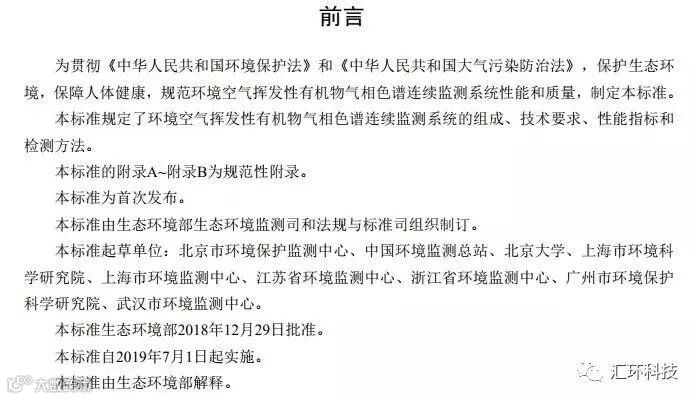为贯彻《中华人民共和国环境保护法》和《中华人民共和国大气污染防治法》,保护生态环境,保障人体健康,规范环境空气挥发性有机物气相色谱连续监测系统性能和质量,制定本标准。本标准规定了环境空气挥发性有机物气相色谱连续监测系统的组成、技术要求、性能指标和检测方法。本标准的附录A~附录B为规范性附录。本标准为首次发布。