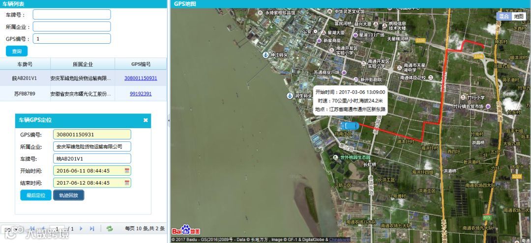 (3)运输管理:运输车辆加装GPS定位,可以在平台GIS地图上定位车辆和回放运输轨迹,方便监管部门对固废运输环节的监管。