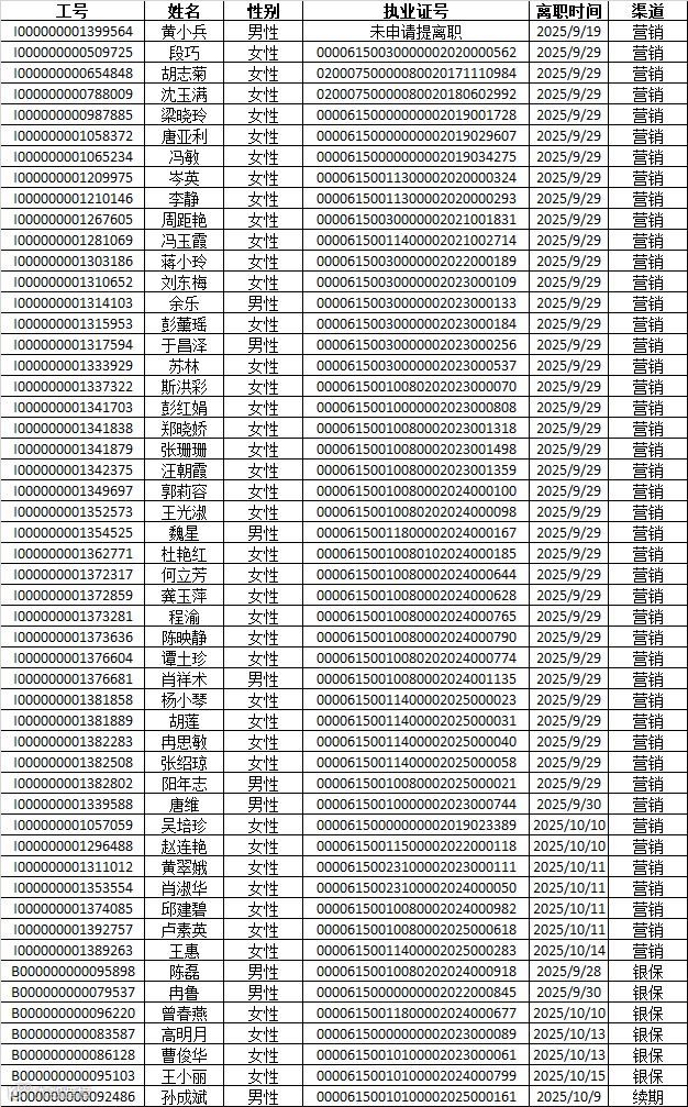 本次公示离职人员包含营销渠道45人,银保渠道6人,续期渠道1人,共计52人。公示的信息包含离职人员工号,姓名、性别、执业证号码以及离职时间。