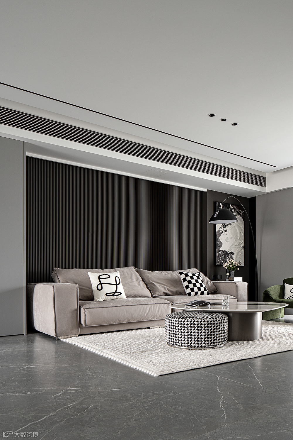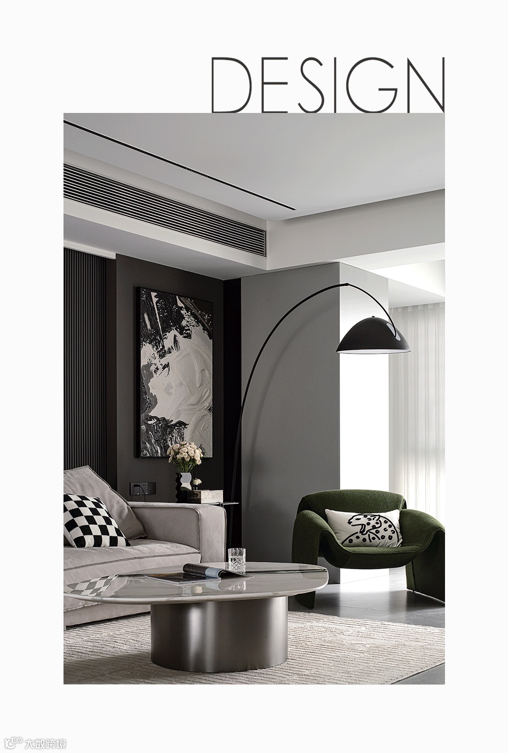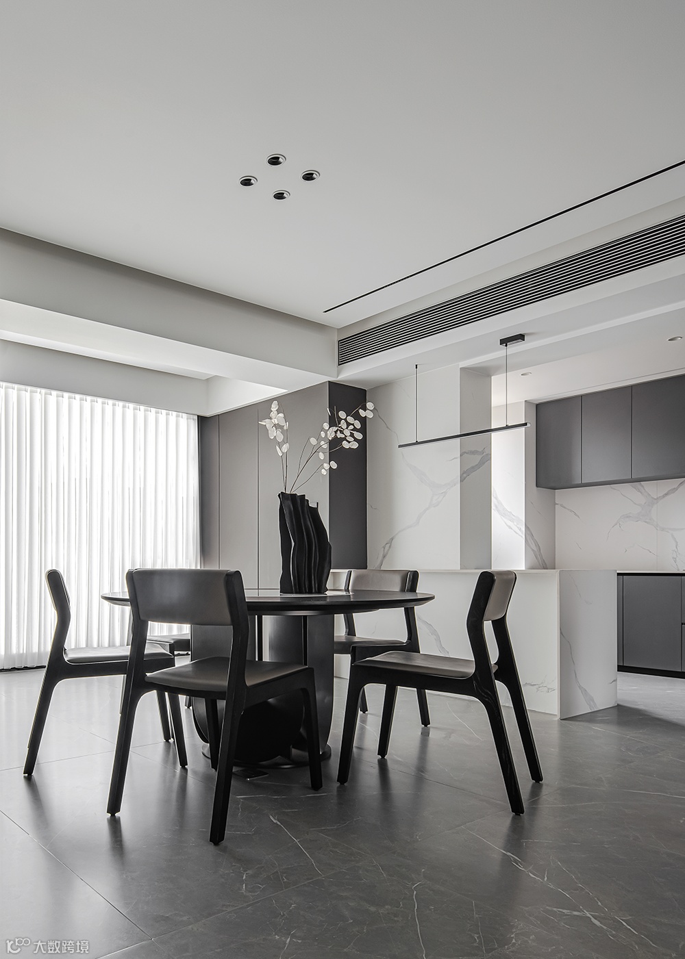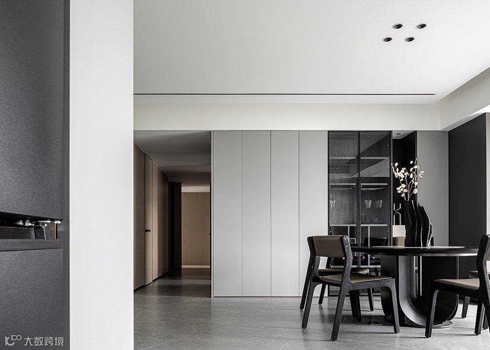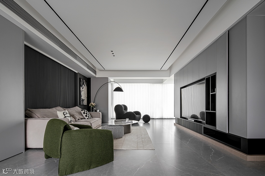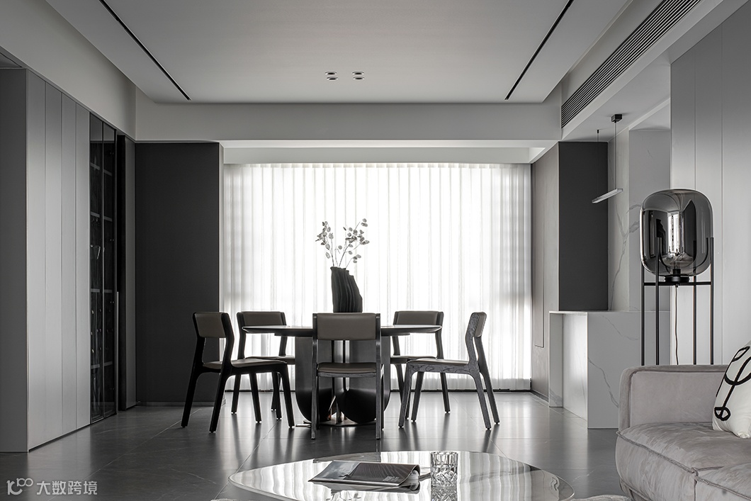 客餐厅一体,使得视觉感官上得到拉伸,整个空间上包括后期的家具配饰的选择上都是以一种极致的黑白来拉开对比;梦幻轻盈的窗帘增加空间的韵律,透过的光线也变得柔和。抹茶绿点缀黑白空间,明朗的线条打造舒适恬静。
