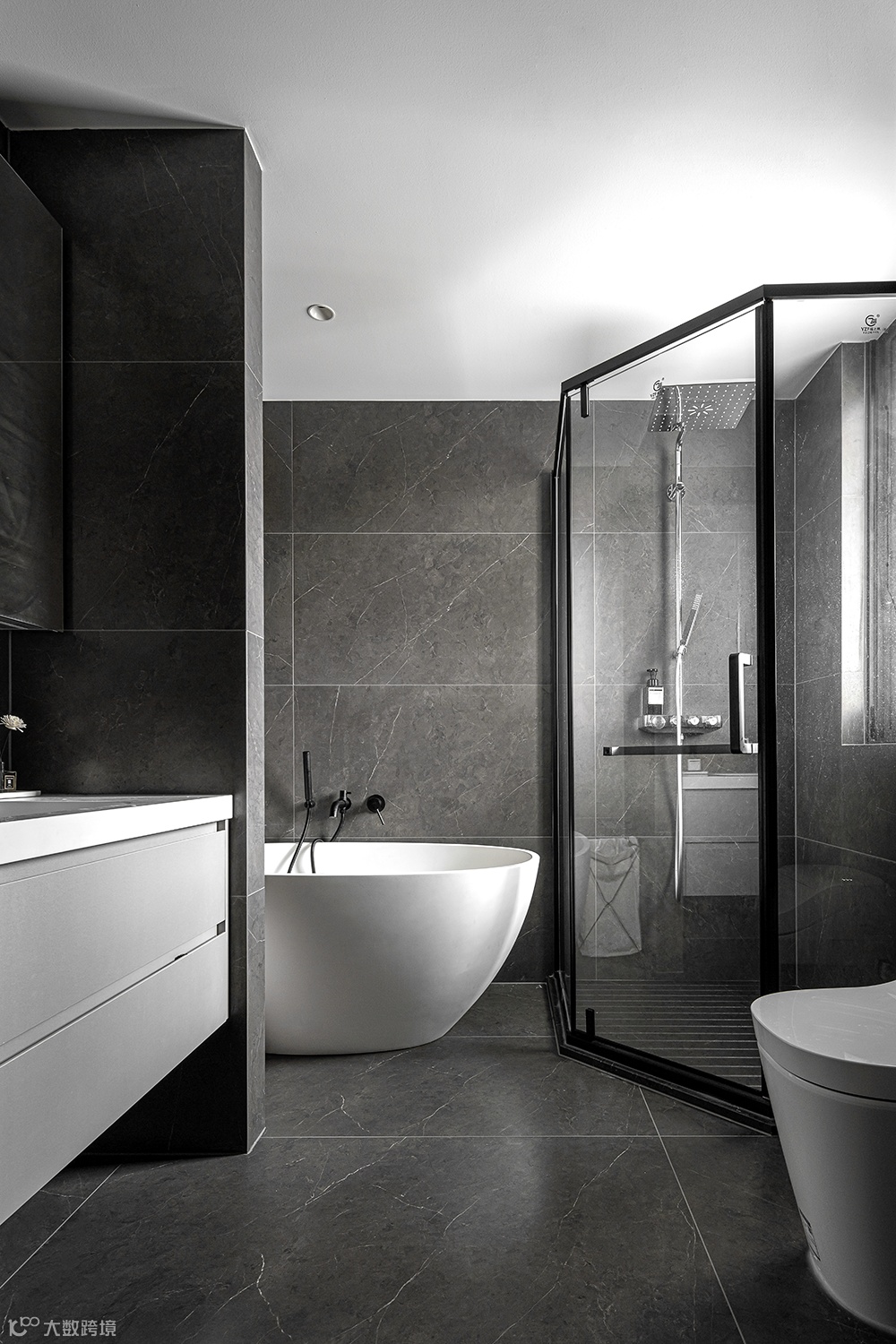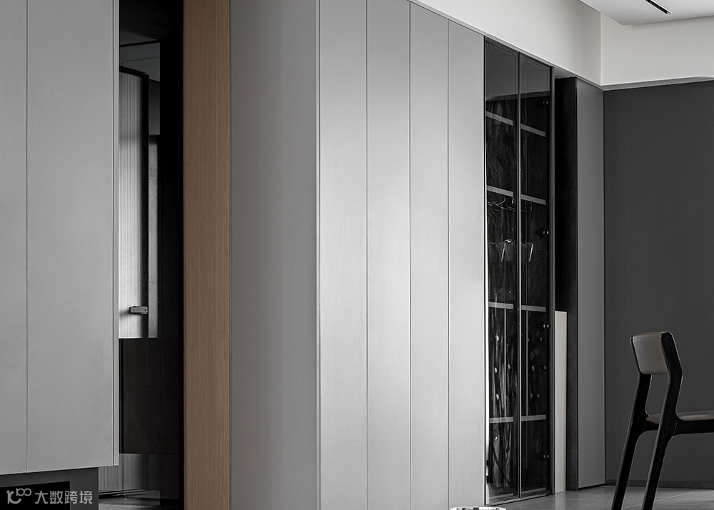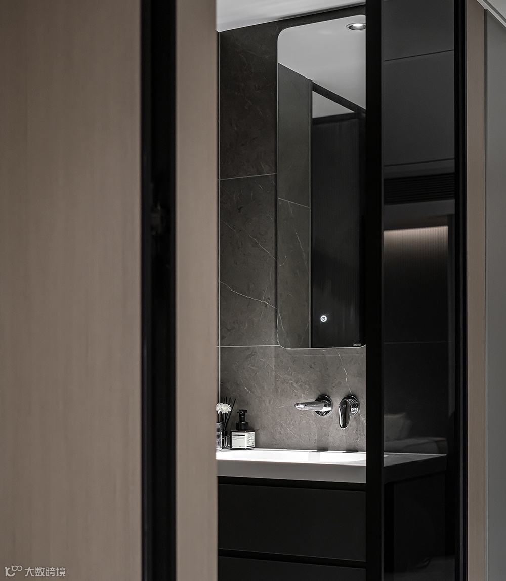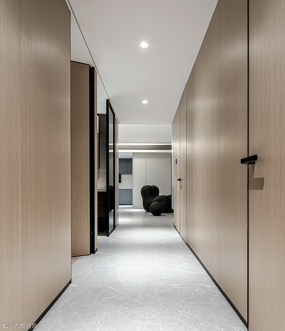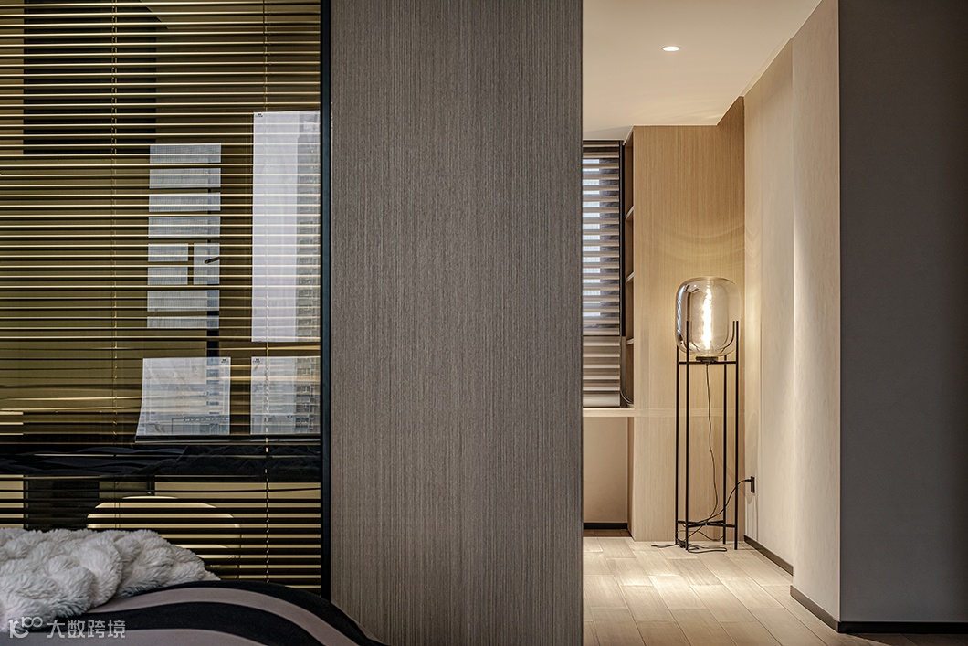 隐形门的设计提升空间整体感,淡雅的色彩引导进入私密空间。梳理动态关系,灯光照明无处不在。