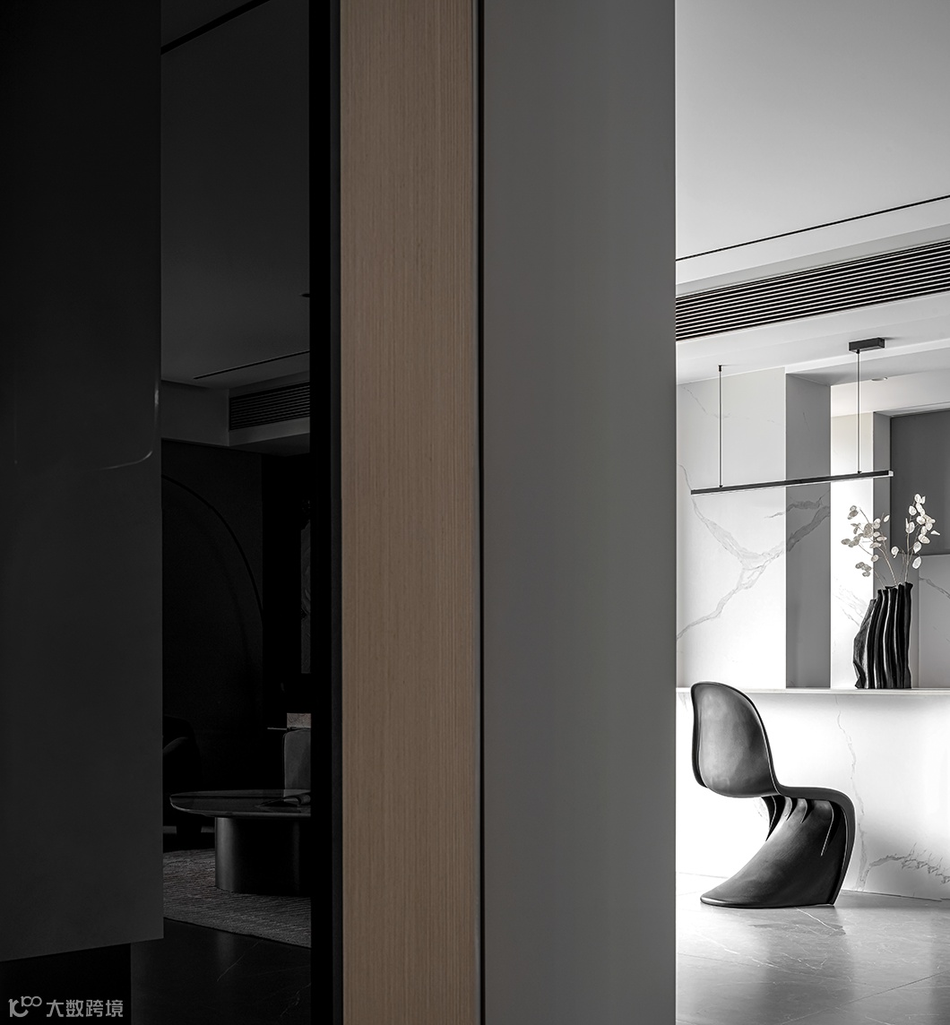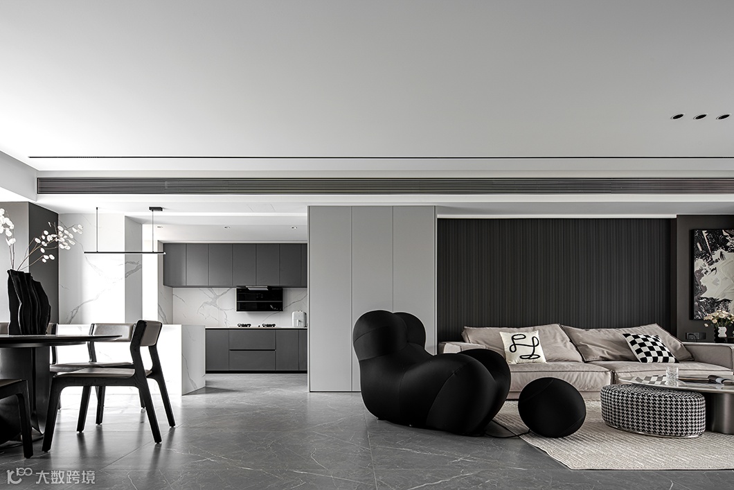 极简的生活主义,意味着人生的松紧有道,一张一弛取得平衡。在空间里做减法,强调黑白之间的极致碰撞,从视觉上拉伸空间感。黑色大幅度的吊灯与造型夸张的单人椅创造出无限的平静。
